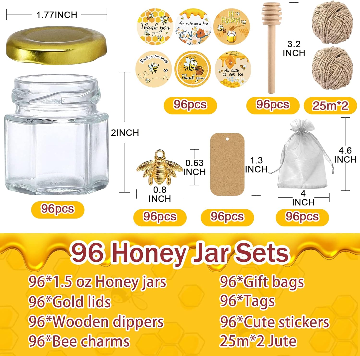 • Great Value Mini Honey Jars Set: This set includes 96 hexagon mini honey jars with dippers, lids, stickers, bee charms, gift bags, tags, and 50m of jute twine. Everything you need to craft thoughtful party favors or sweet handmade gifts with ease.