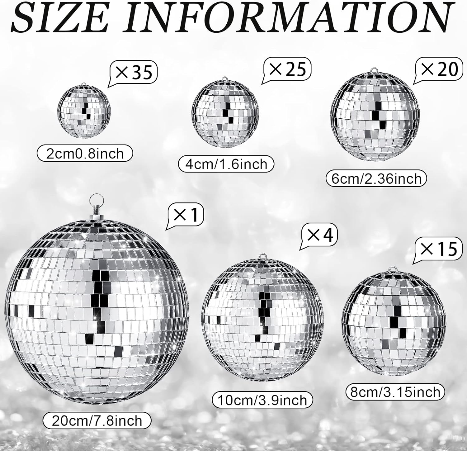 • Disco Balls Bulk: you will get 100 pieces of disco balls in different sizes, including 50 for 3 cm/ 1 inches, 35 for 5 cm/ 2 inches, 10 for 8 cm/ 3 inches, 3 for 10 cm/ 4 inches, 1 for 15 cm/ 6 inches, 1 for 20 cm/ 8 inches, sufficient quantity to decorate your Christmas tree or party scene and add brightness and energy to your party