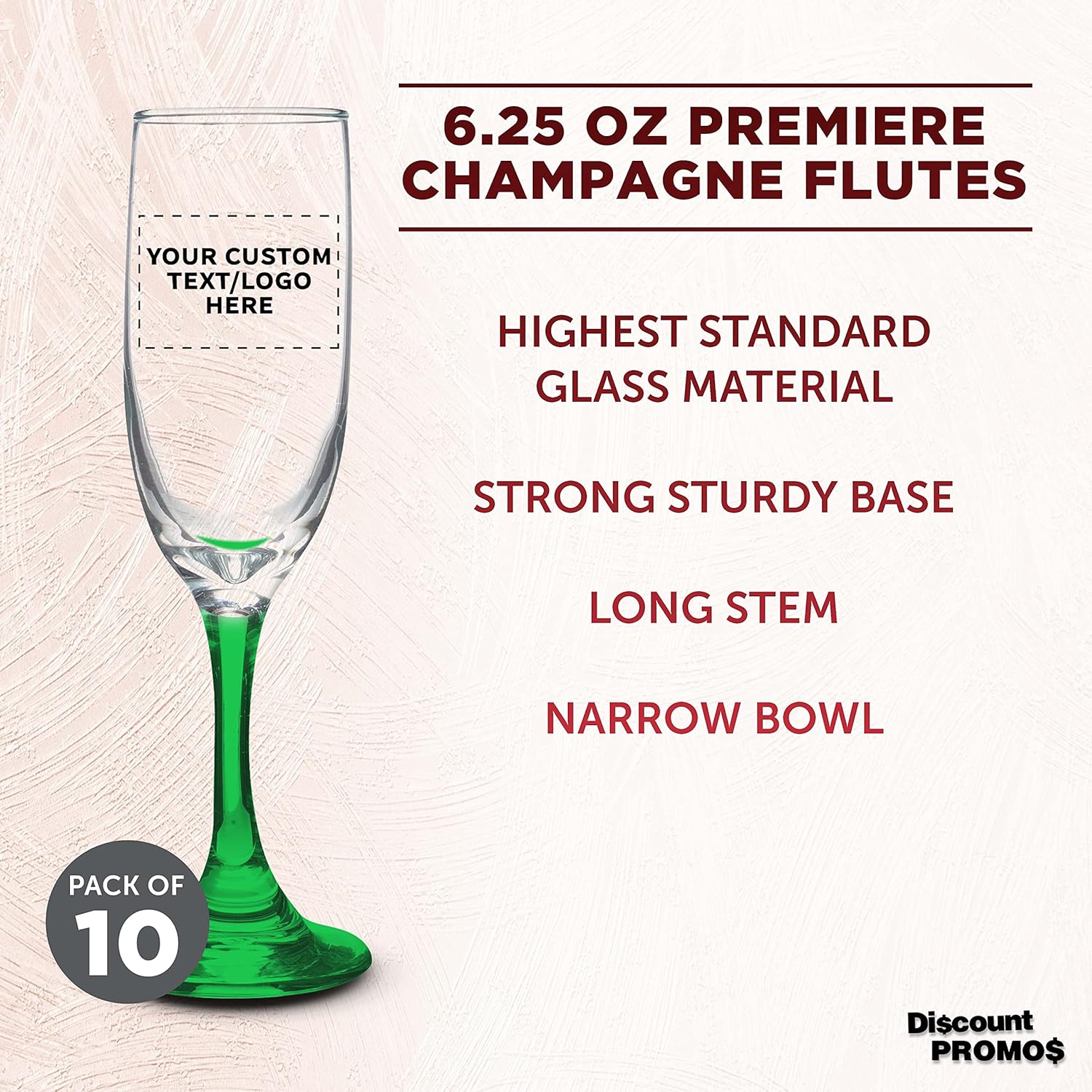 DISCOUNT PROMOS Custom Premiere Champagne Flutes 6.25 oz. Set of 10, Personalized Bulk Pack - Elegant Drinkware for Weddings, Events, & Promotional Gifts - Green