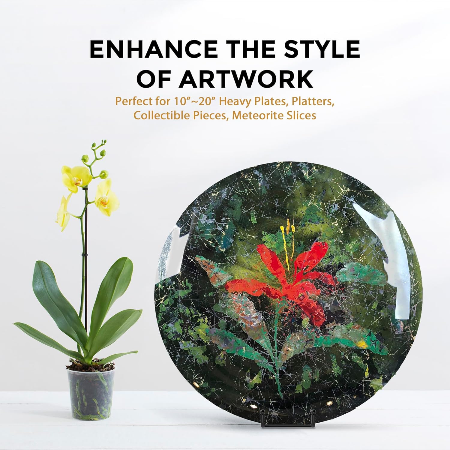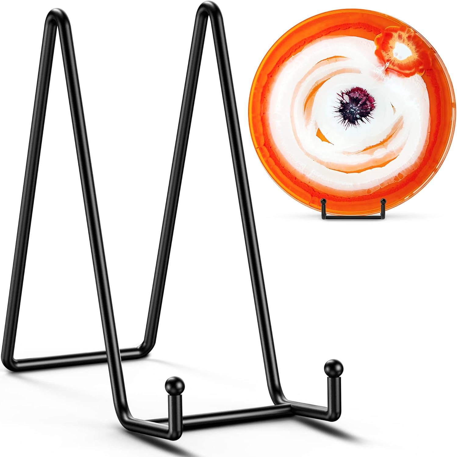 • STURDY DESIGN: - Made with wrought iron construction and a matte black powder-coated finish, this plate display stands features a reliable 8" depth and 4" widened base design, capable of securely displaying a variety of large items such as decorative plates, platters, plaques, photo frames, trays, tiles, cutting boards, cookbook, sign, canvas art, and more.