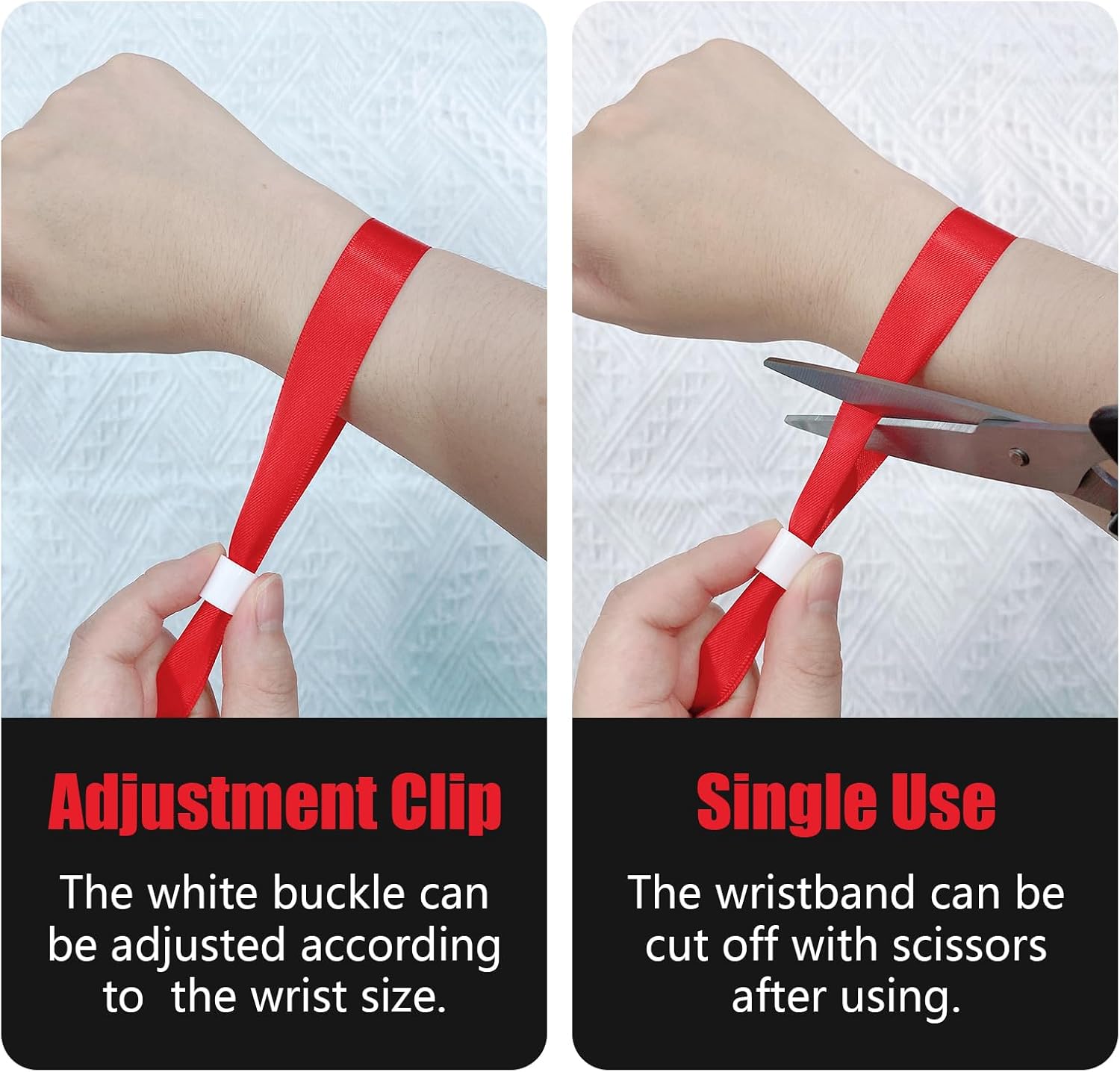 • Event wristbands party: Our wristbands are comfortable and stretch resistant. We offer wristbands in sufficient quantity and multiple colors. Disposable ribbon wristbands that can be adjusted to fit your wrist size. They are soft and comfortable to wear and have a beautiful surface to meet your needs for use and sharing in various occasions.