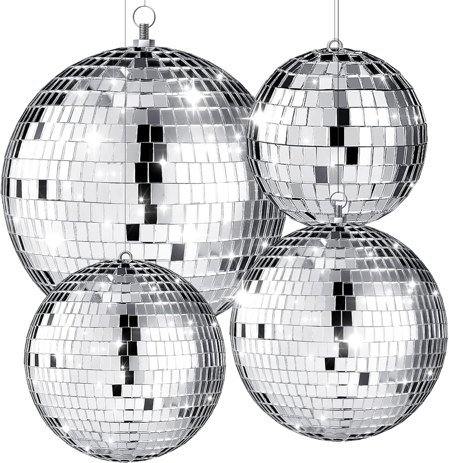 4 pack Large Disco Ball Silver Hanging Disco Balls Reflective Mirror Ball Ornament for Party Holiday Wedding Dance and Music Festivals Decor Club Stage Props (12 Inch, 8 Inch, 6 Inch, 4 Inch)