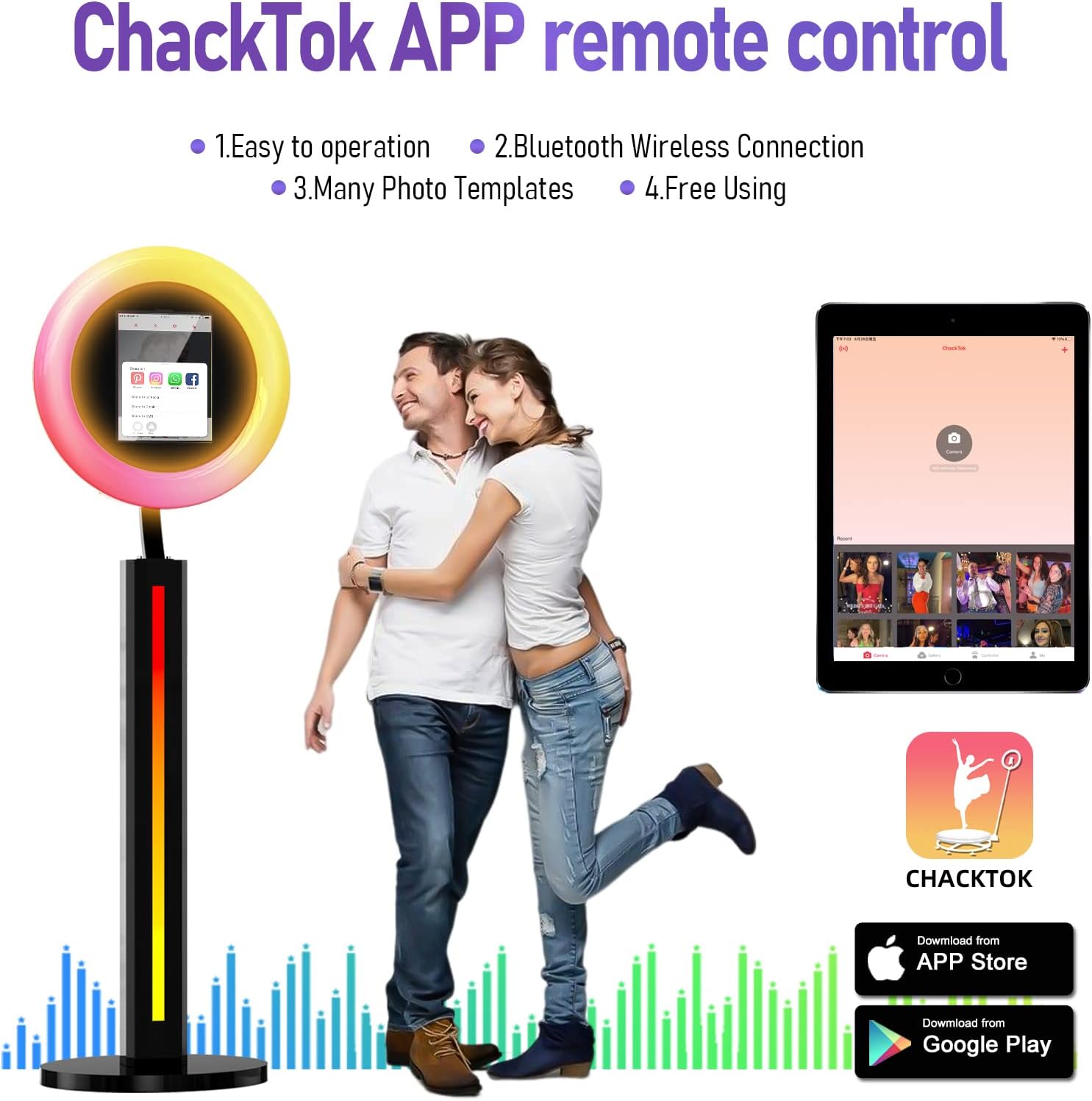 • 【Photo Booth RGB with Ring Light】This Portable Photo Booth is equipped with RGB ring light, 20+ color lighting modes, each lighting mode can choose 1%-100% brightness. you can adjust the color temperature (2700K-6500K) and brightness (0%-100%) by the remote control. And the angle of the ring light is flexible and adjustable.