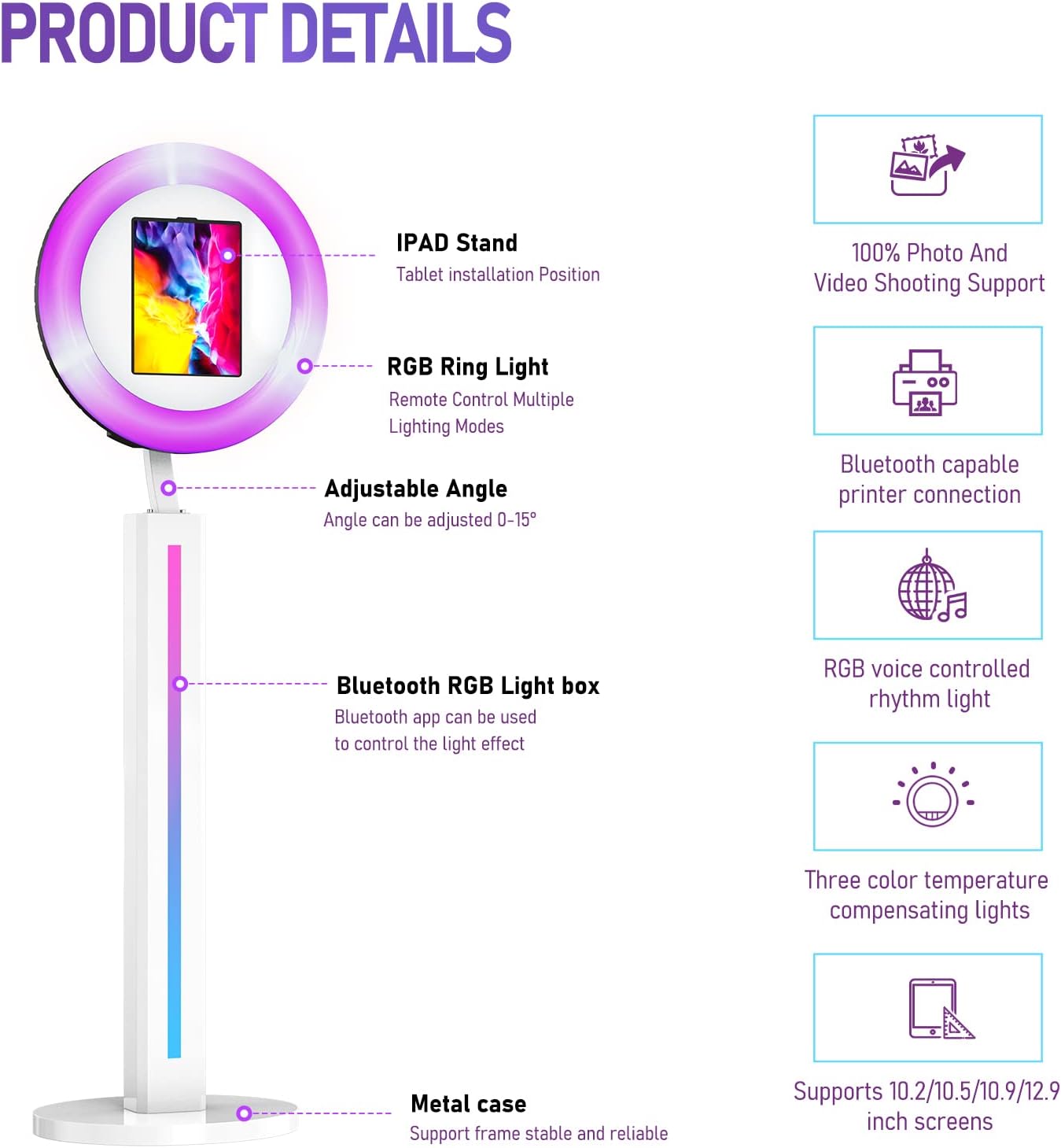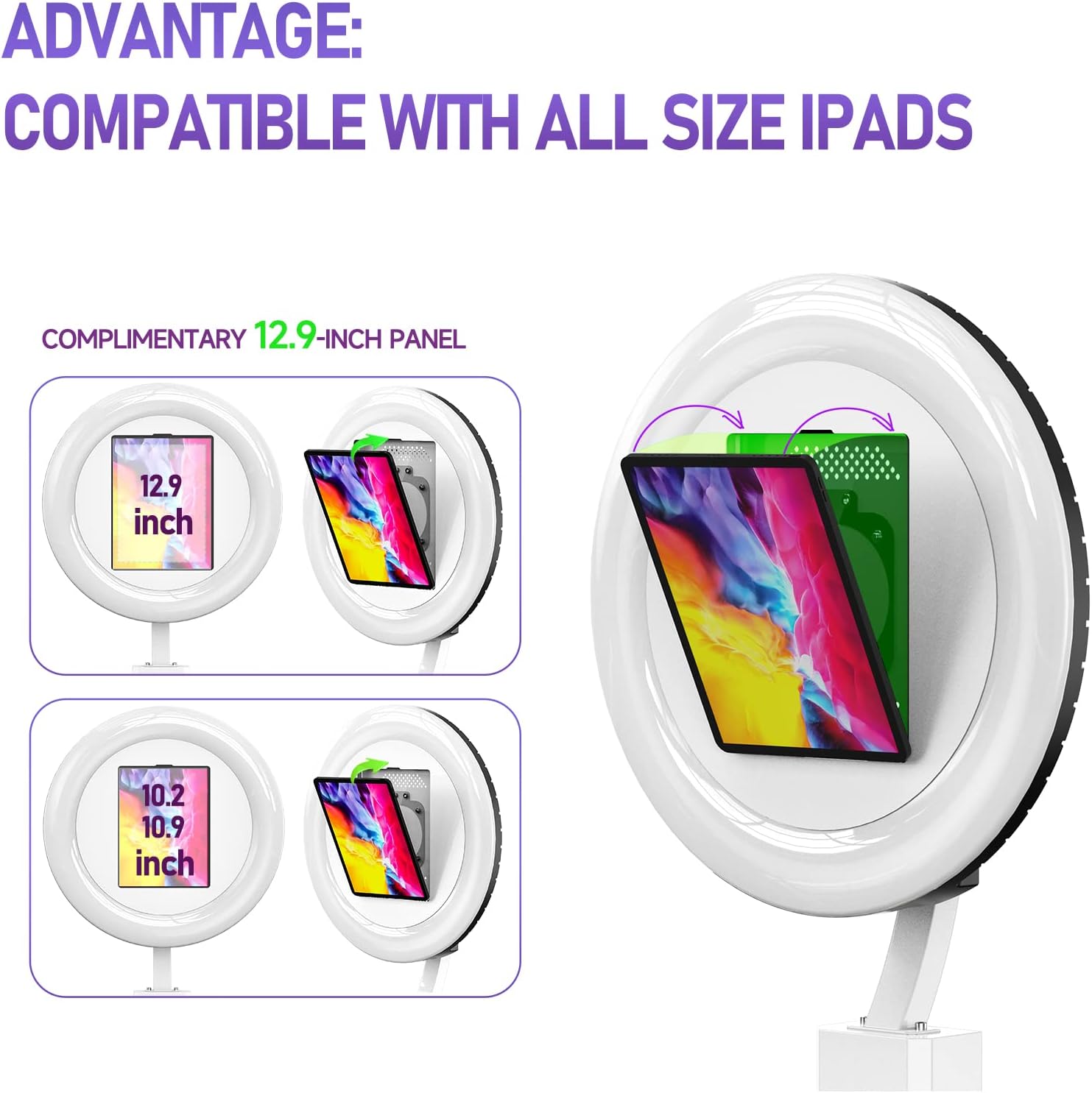• 【Advantage:Compatible with All Size iPads】HARZHI iPad photo booth can be compatible with all size iPads ( 10.2in 10.9in 12.9in), which is more convenient to use. Other iPad photo booths only work for one size. If you want to change the iPad, you must buy another iPad photo booth. HARZHI Ipad Photo Booth is universal. For 12.9-inch iPads before 2018, please contact us for customized panels.