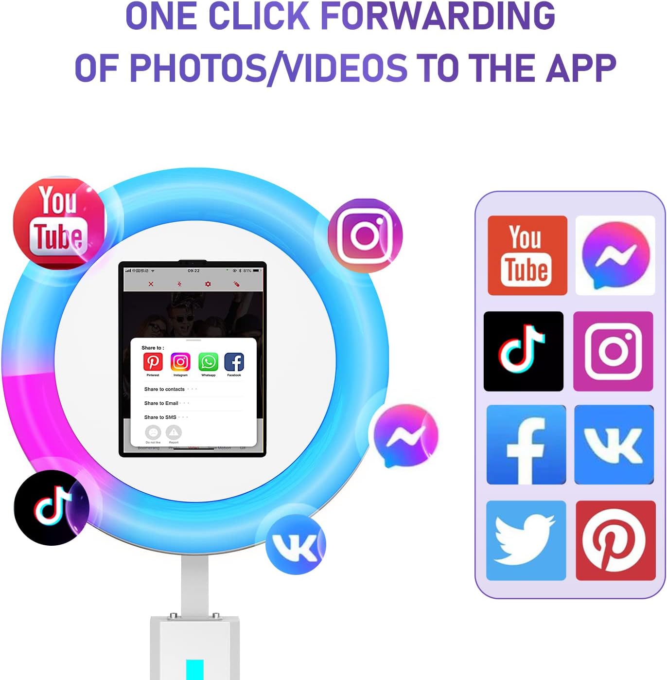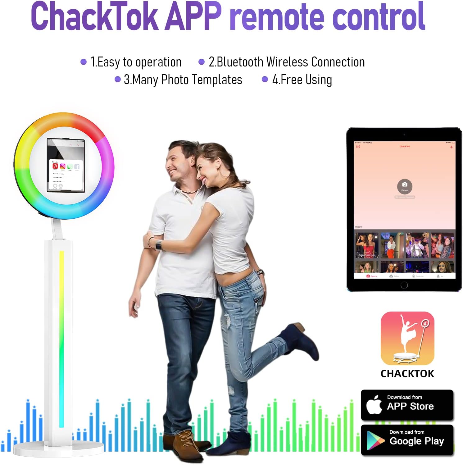 • 【Photo Booth RGB with Ring Light】This Portable Photo Booth is equipped with RGB ring light, 20+ color lighting modes, each lighting mode can choose 1%-100% brightness. you can adjust the color temperature (2700K-6500K) and brightness (0%-100%) by the remote control. And the angle of the ring light is flexible and adjustable.