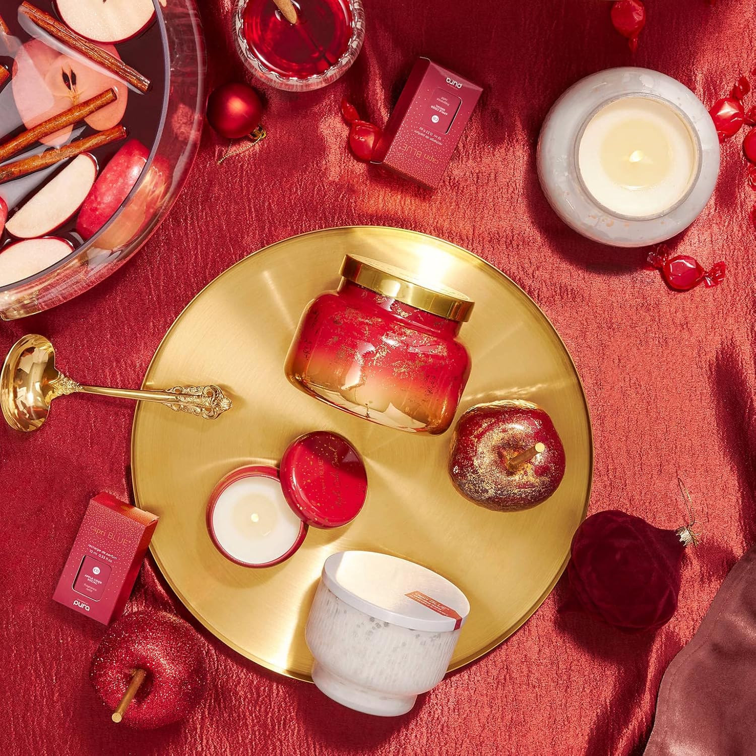 Capri Blue Glimmer Mini Tin - Apple Scented Candle with Mini Candle Holder - Soy Wax Blend - Capri Blue Apple Cider Social Red and Gold (3 oz)