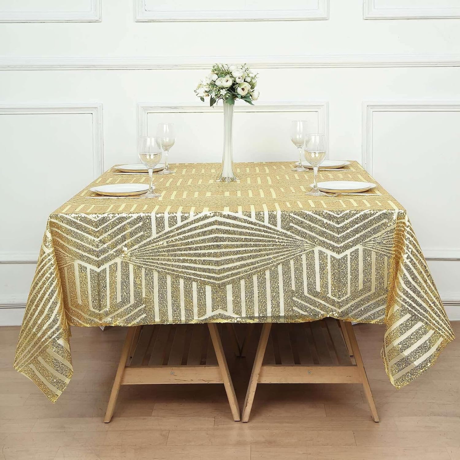 • Quantity: 1 Table Overlay Material: Shiny Sequin Beads atop Tulle Net Fabric Color: Gold Style: Geometric Lines Pattern Size: 72"L x 72"W Edges: Serged Seamless 1pc Design