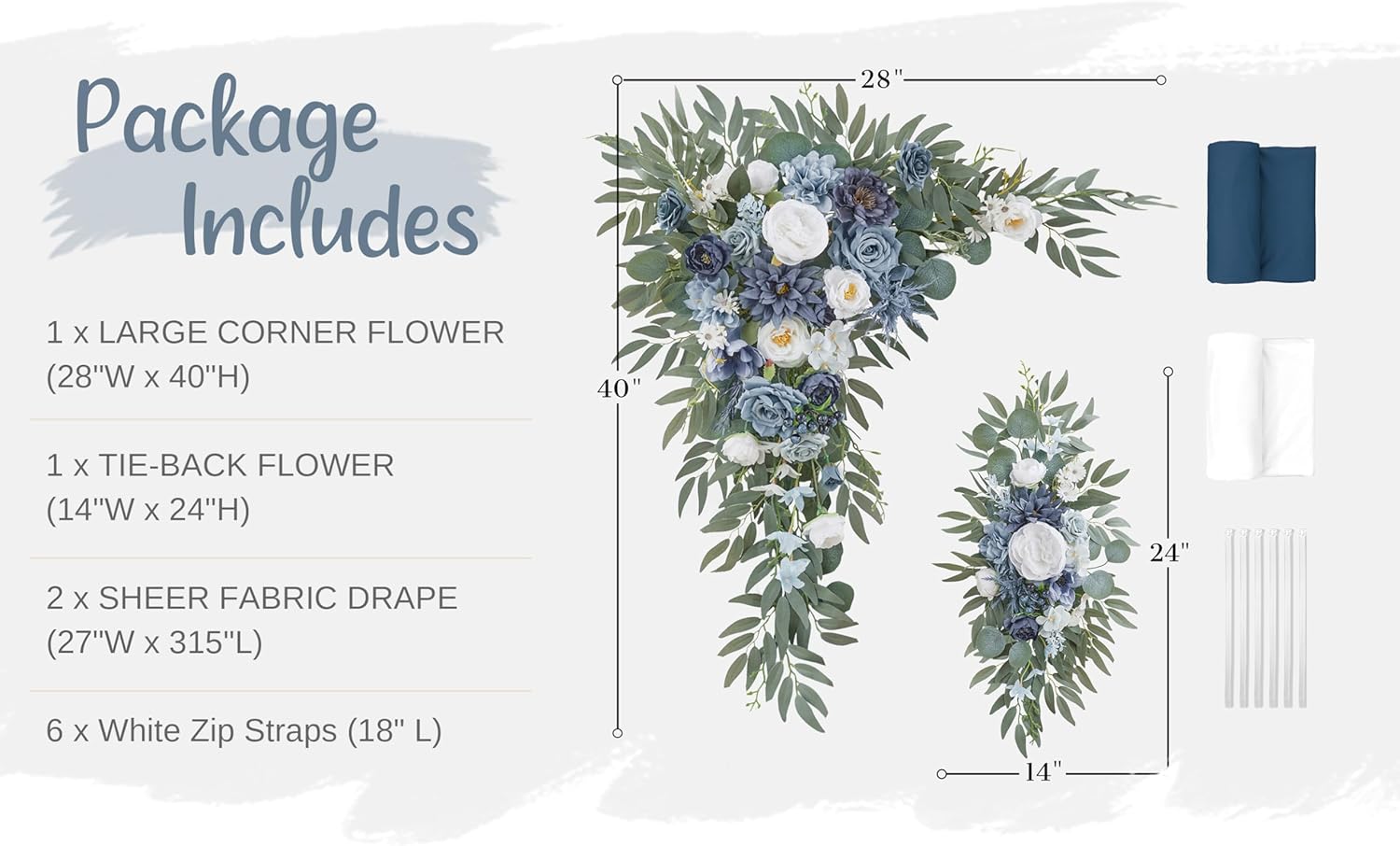 • PAKEAGE LIST: 1 x Large Corner Flower Swag of 28 "W x 40 "H + 1 x Large Tie-Back Flower of 14 "W x 24 "H + 2 x Hanging Sheer Drapes of 315 x 28 inch + 6 x White Zip Straps of 17.7 inch + 1 x Instruction Card + 1 x Glue Stick (Not include wood arch stand)