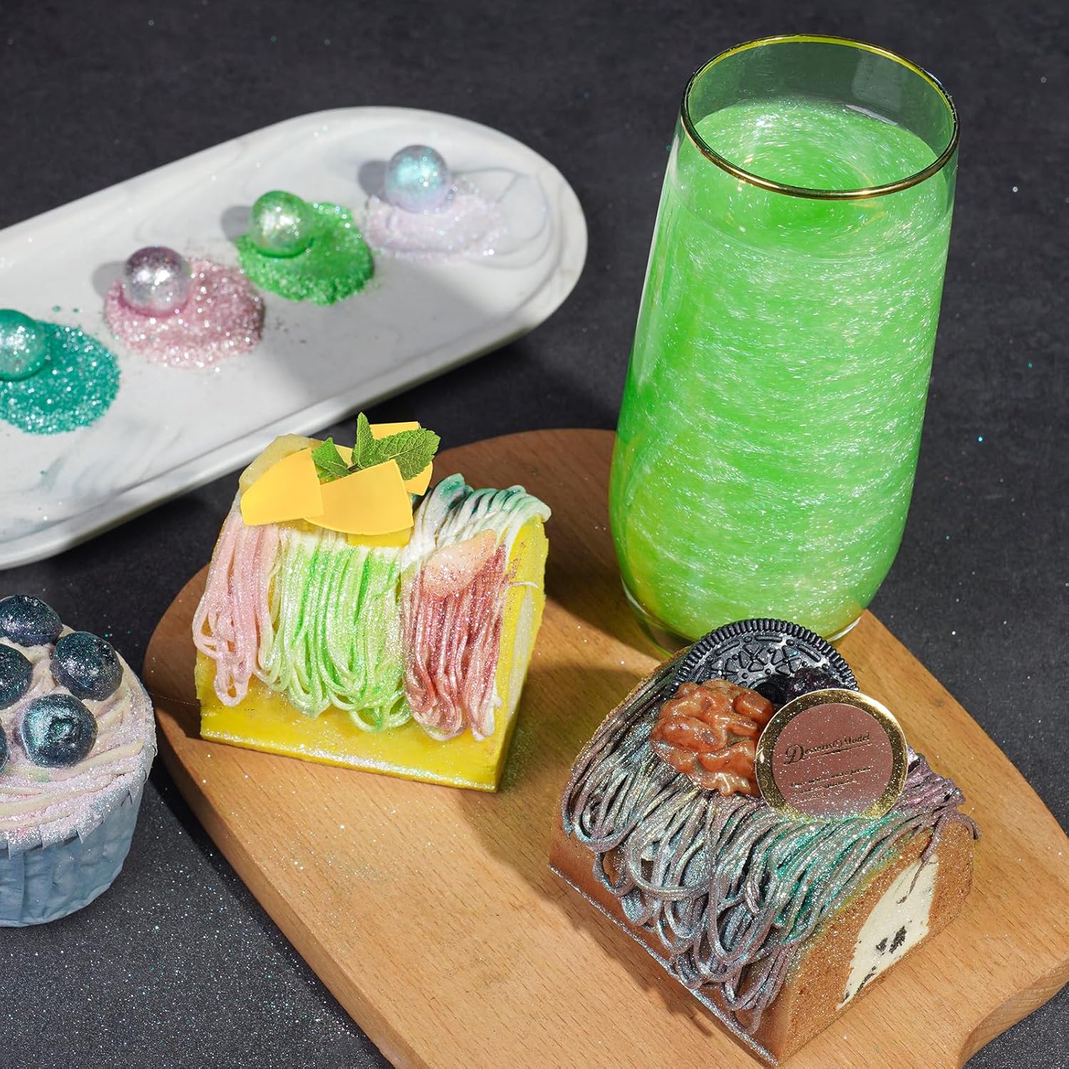 • ✔️【Use with Brews】Food-grade glitters are so fun and simple to use with brews. Add one pinch or two directly to your favorite beverage, mix it with cocktail syrups, juices, liqueurs, liquors, or spirits. Use a clear glass instead of opaque containers so that the liquid looks so cool, especially when you move it around in the glass with a stir. A tiny amount of dust can create a great visual spectacle, and clear liquids offer a great blank canvas for glitter to show off the best ability.