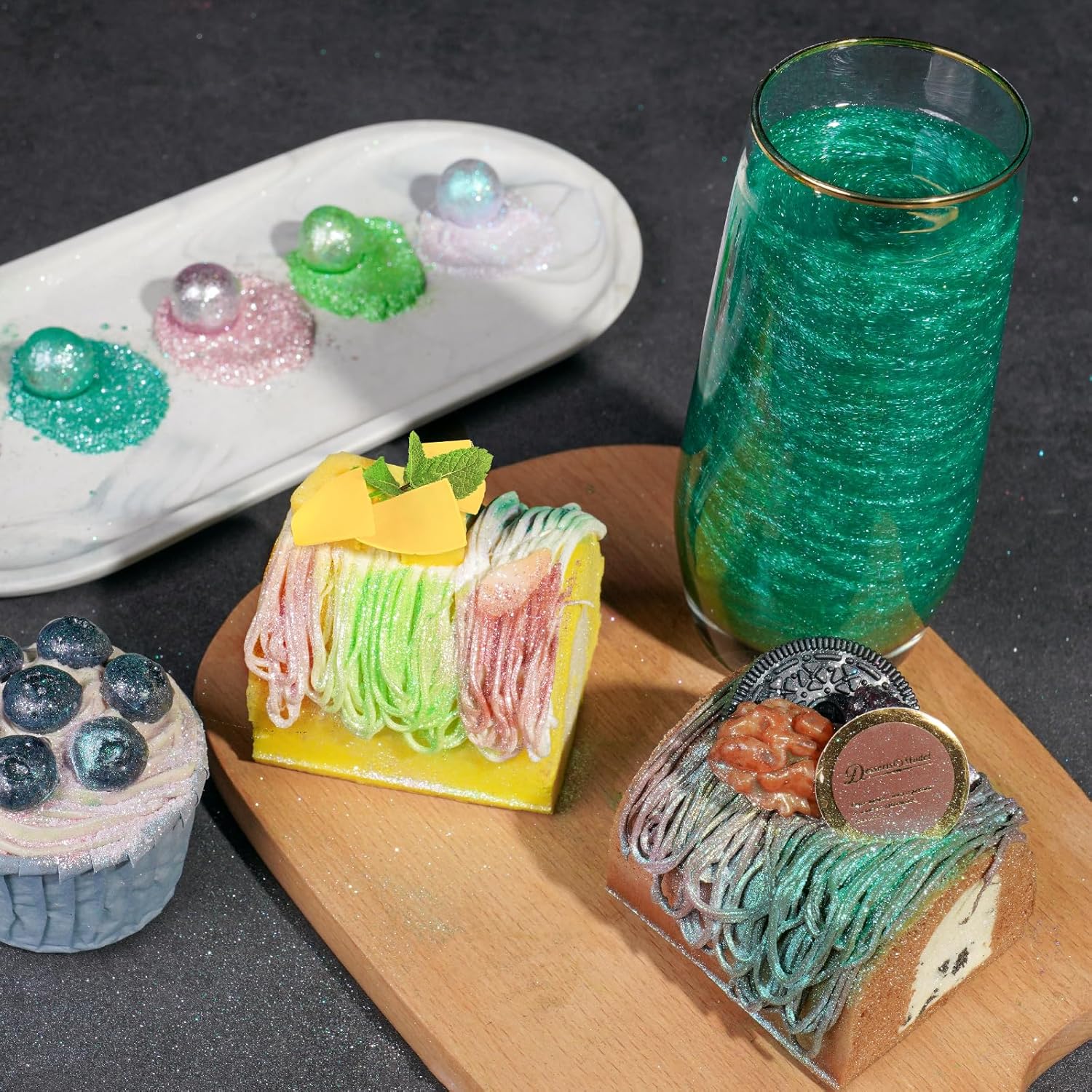 • ✔️【Easy to Use】Specially developed for food decoration and craft industries, this luster dust produces realistic looks by highly pigmented colors with a metallic finish. The pretty fine grain is more convenient for painting. To add glimmer and sparkle to your creations, simply sprinkle or dry brush the luster glitters on them. This product adheres very well to both wet and dry mediums. Attention: Seal and store glitter powder in a cool and dry place after use. Do not expose to excessive heat.