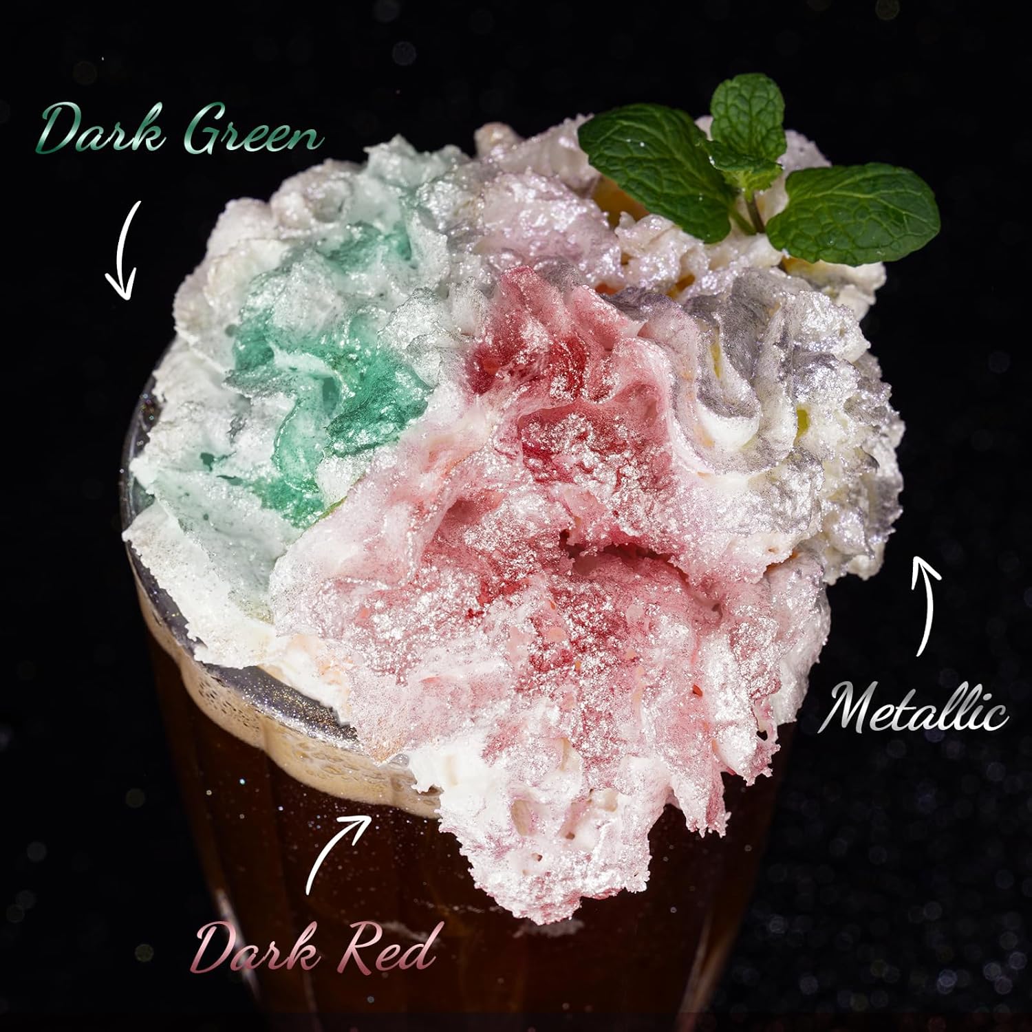 • ✔️【Use with Brews】Food-grade glitters are so fun and simple to use with brews. Add one pinch or two directly to your favorite beverage, mix it with cocktail syrups, juices, liqueurs, liquors, or spirits. Use a clear glass instead of opaque containers so that the liquid looks so cool, especially when you move it around in the glass with a stir. A tiny amount of dust can create a great visual spectacle, and clear liquids offer a great blank canvas for glitter to show off the best ability.