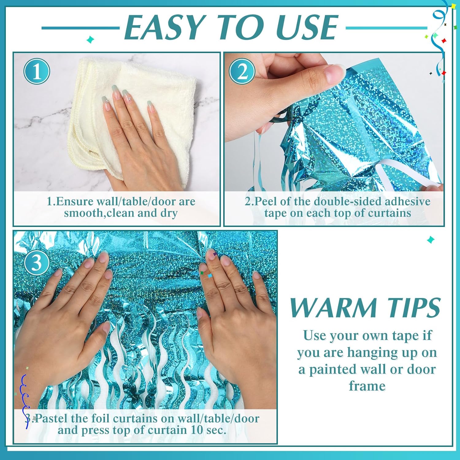 • Easy to Assemble: the tinsel curtain backdrop has a tape behind it for you to stick on decorative places such as walls, windows, tables and doors to create a blue green world, full of romantic atmosphere, so that you and your partners can have fun, and you can take pictures for memory