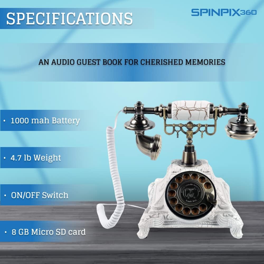 • Ideal Gift: The Audio Guest Book Phone from the Spinpix360 makes for a unique and thoughtful gift. It's perfect for anyone who appreciates vintage and retro items, and is an ideal choice for weddings, birthdays, anniversaries, or retirement parties. It's also a great way to preserve memories from any special occasion, and will be treasured for years to come.