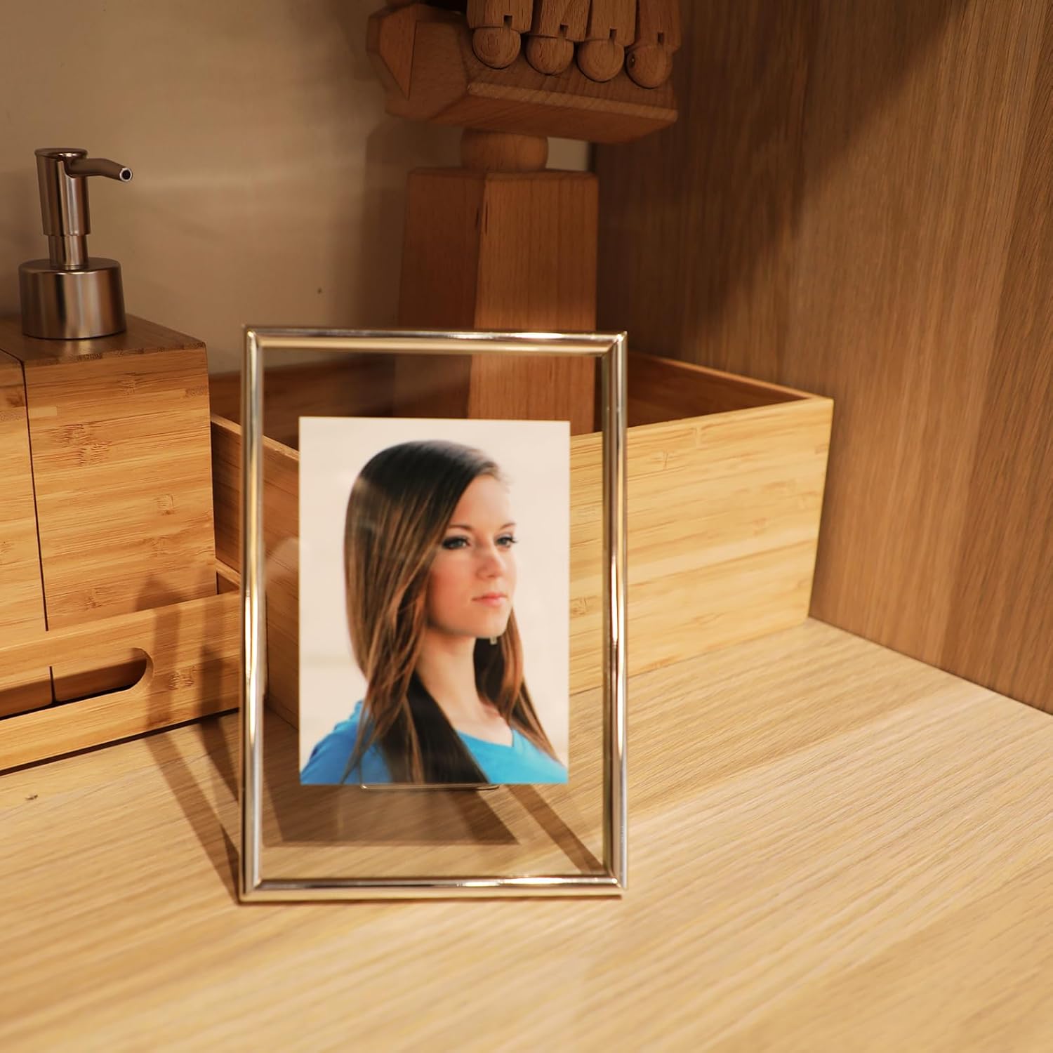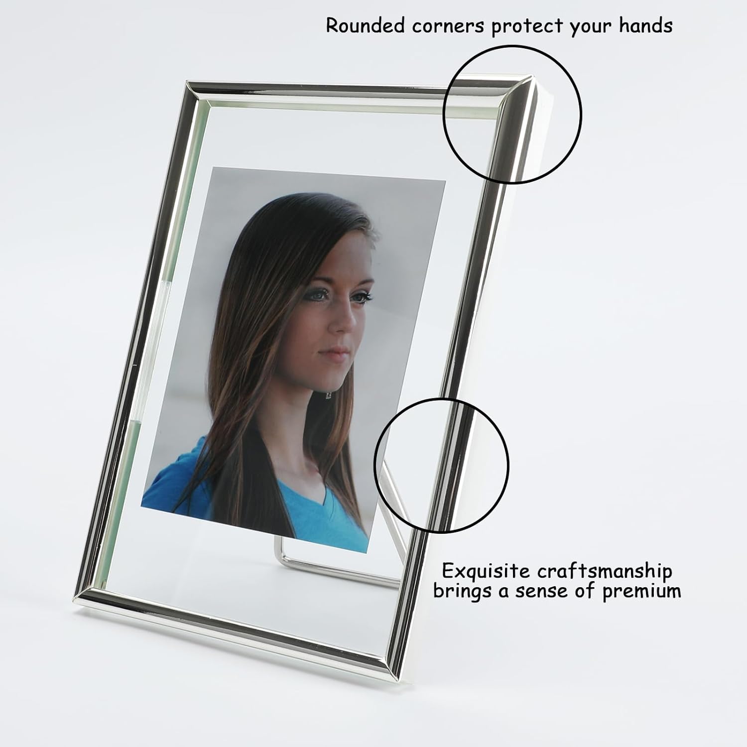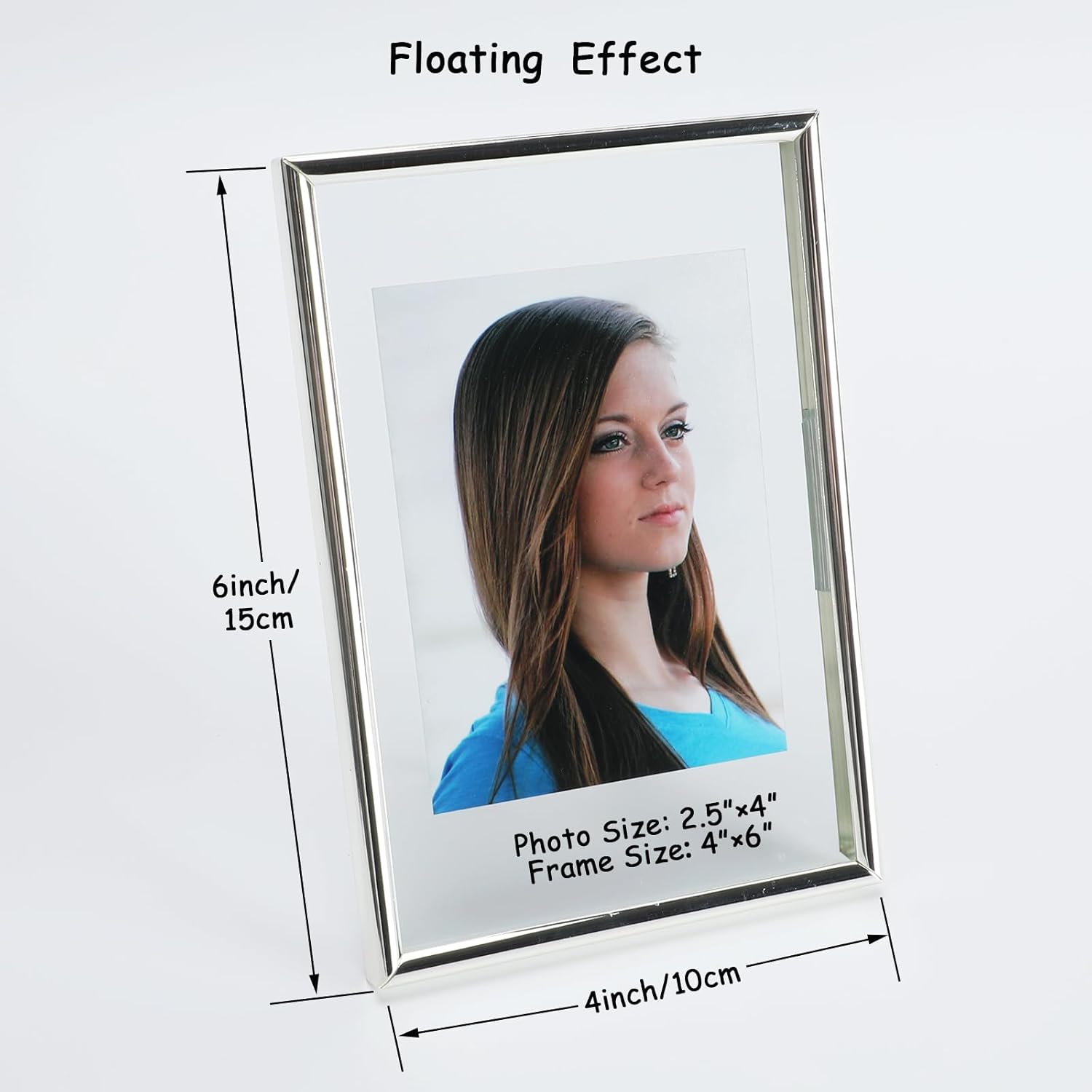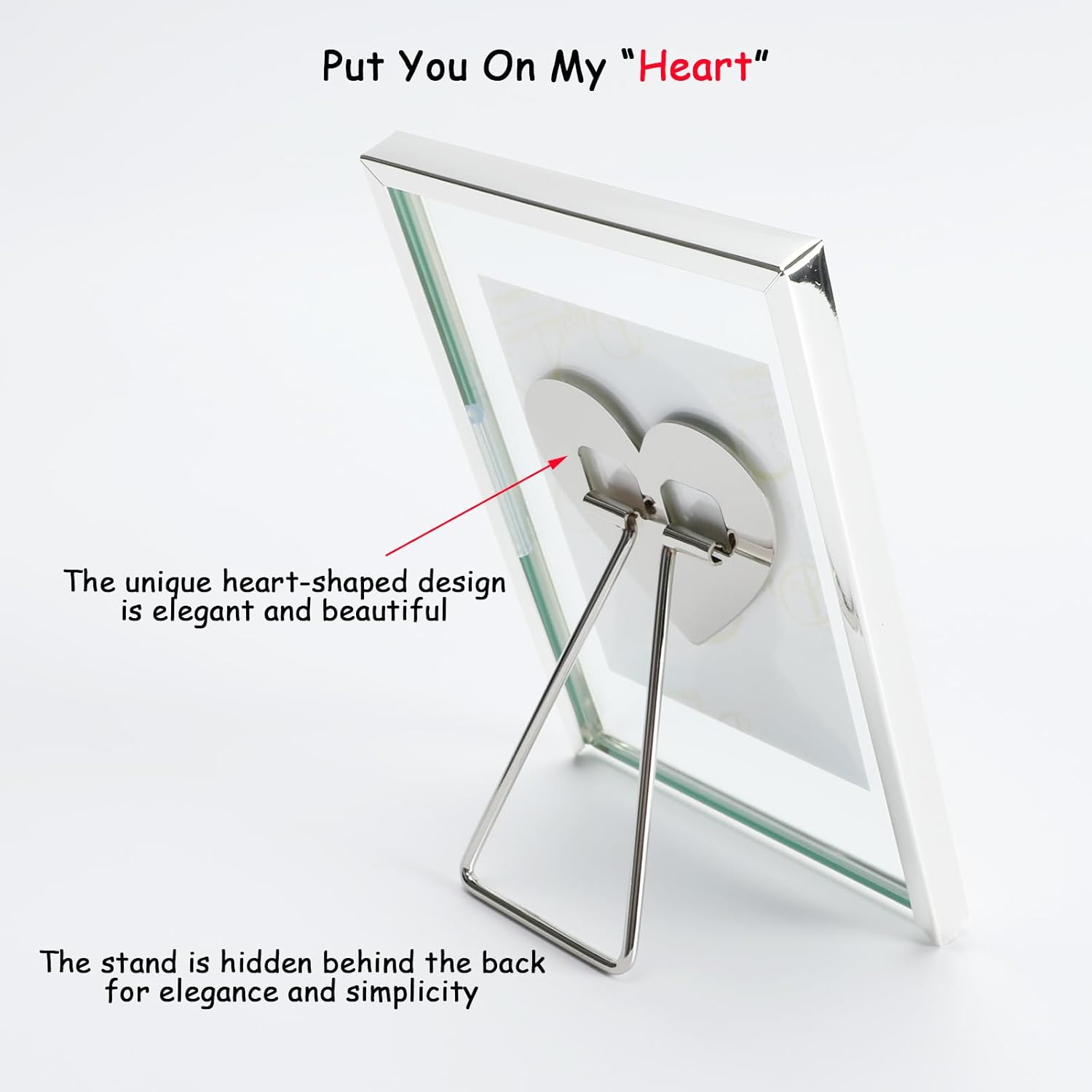 • 【Romantic Design】A silver metal frame with heart-shaped stand(Put you in my heart) and transparent glass, making it looks very romantic and elegant. It appears that the photo has a floating effect on it, So you can focus on the photo.