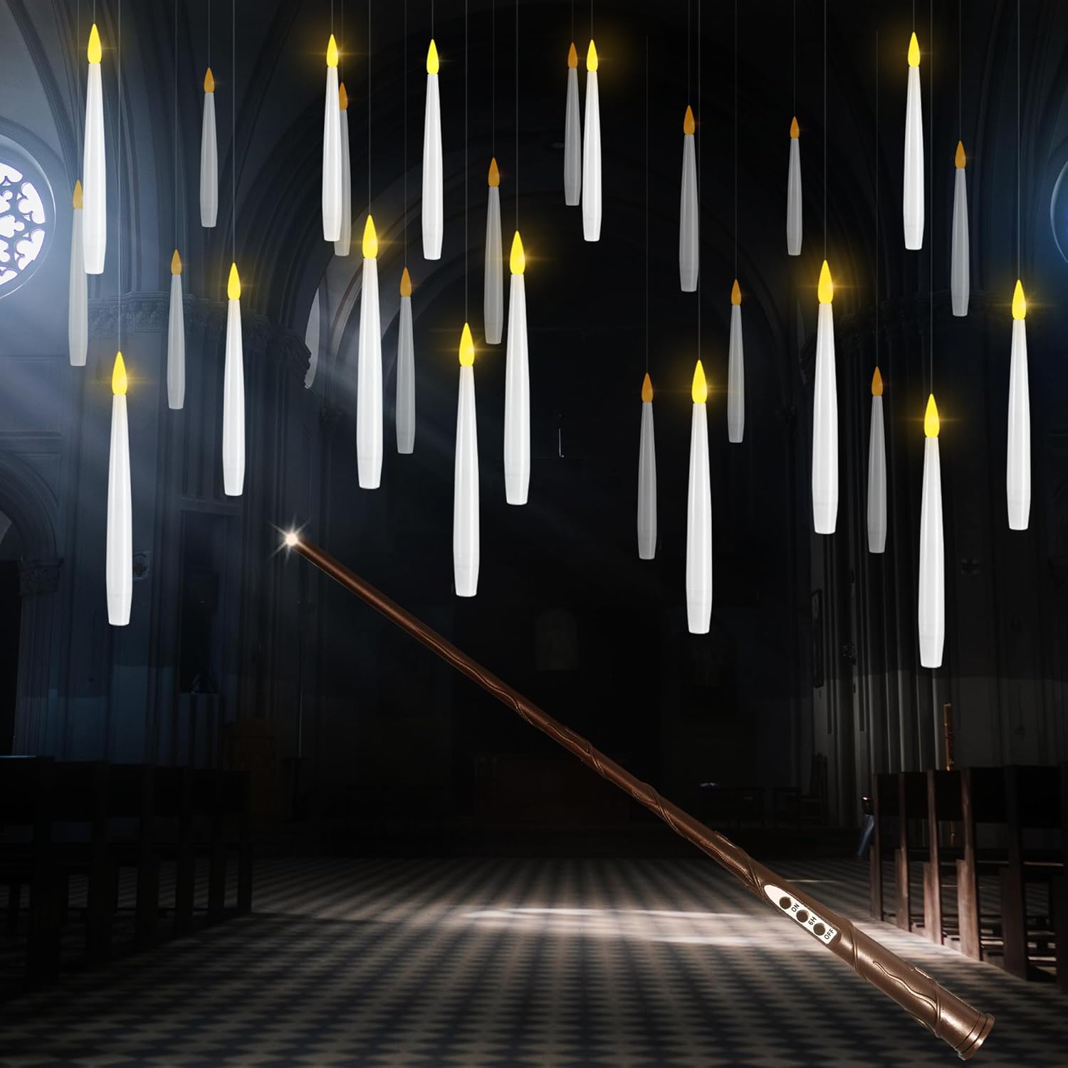 • LONG PRESS "ON" FOR 1-3 SECONDS FOR FLICKERING EFFECT🔮FLOATING CANDLES WITH WAND🔮 Start your magical journey with a cool magic wand remote! It can switch all the flickering flamless candles ON and OFF simultaneously just like magic. Your magic wand remote requires only 1x AAA battery before use(not included). By one click, you can magically light up your floating candles hanging in the air and long press ON, you can change the candles light to flicker effect just like real candles do.