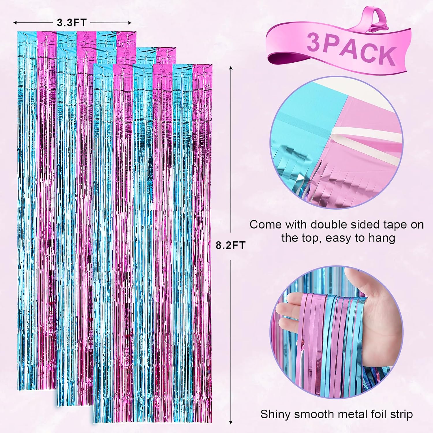 3 Pack 3.3x8.2 Feet Blue and Pink Foil Fringe Backdrop Curtains, Tinsel Streamers Birthday Party Decorations, Fringe Backdrop for Graduation, Baby Shower, Gender Reveal, Disco Party