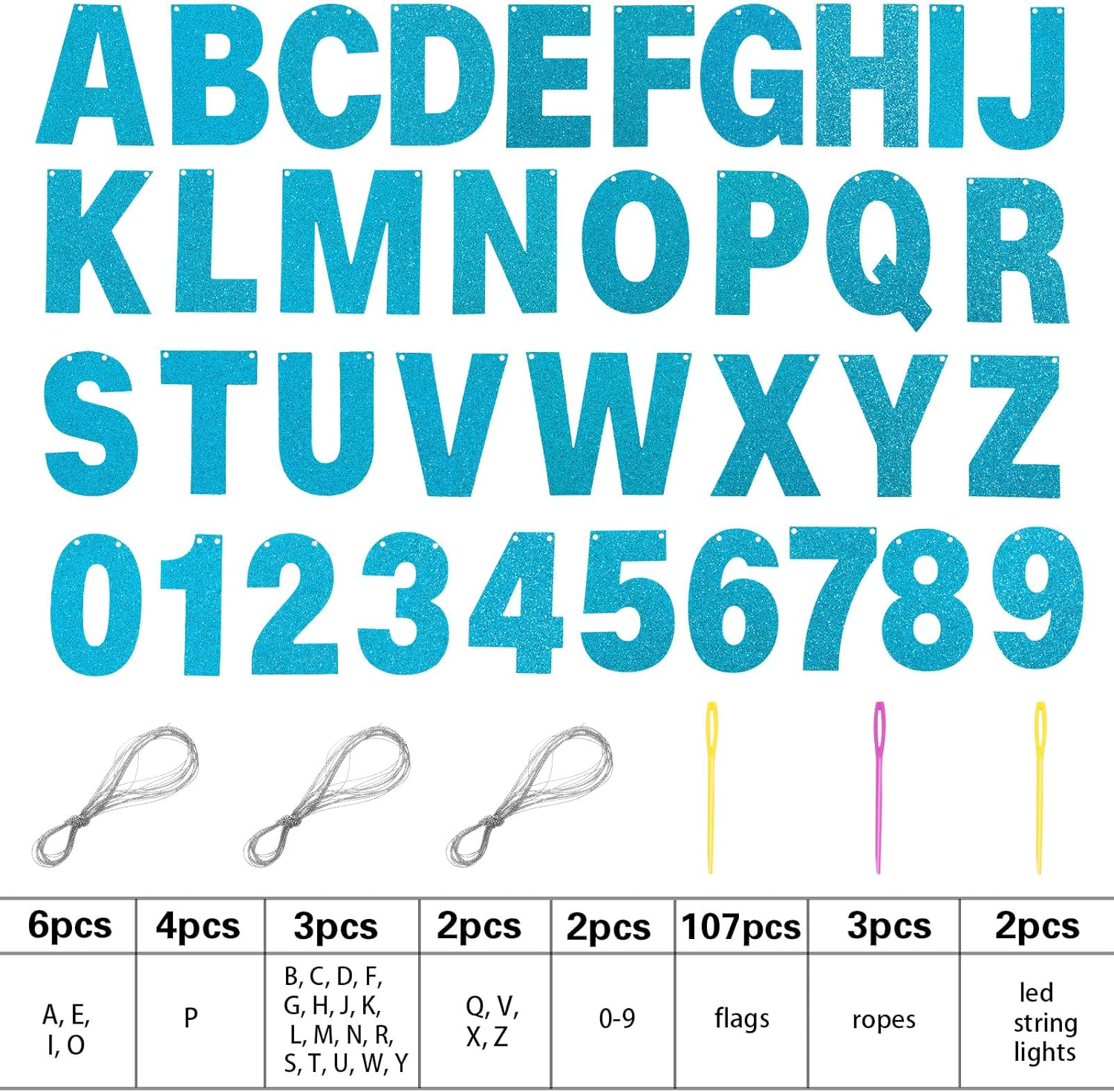 TaoBary 112 Pcs DIY Letter Custom Banner Glitter Customizable Banner Kit Including 107 Letters and Numbers 3 Rope for Valentine Birthday Party(Baby Blue)
