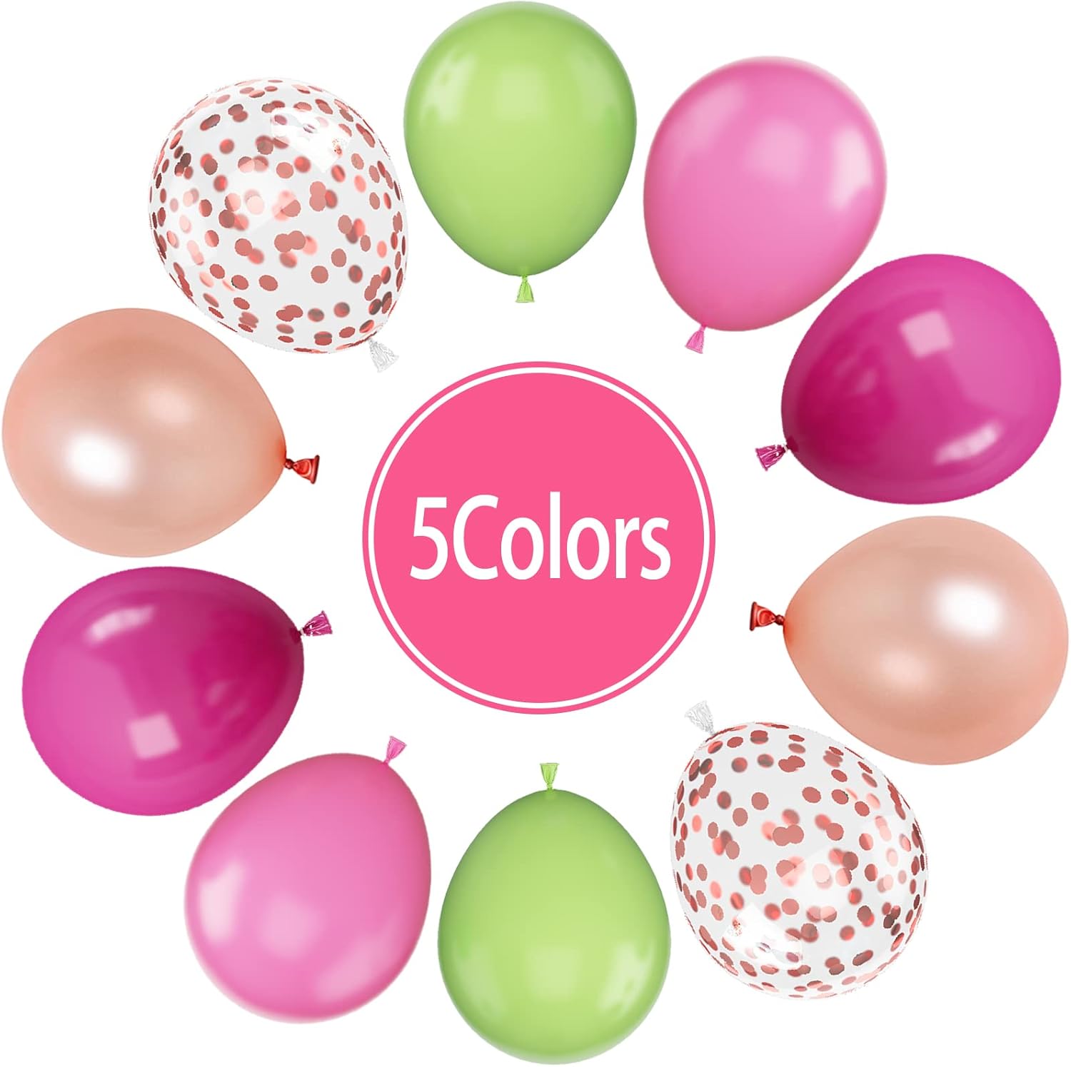• Mixed Balloons Set: The 12 inch green hot pink rose gold balloons set includes 15pcs light green balloons, 15pcs pink balloons, 10pcs hot pink balloons, 10pcs pearl rose gold balloons, 10pcs rose gold confetti balloons, 2 roll of ribbon. 62pcs in total. A variety of tropical party latex balloons set is suitable for your beautiful art theme decoration.