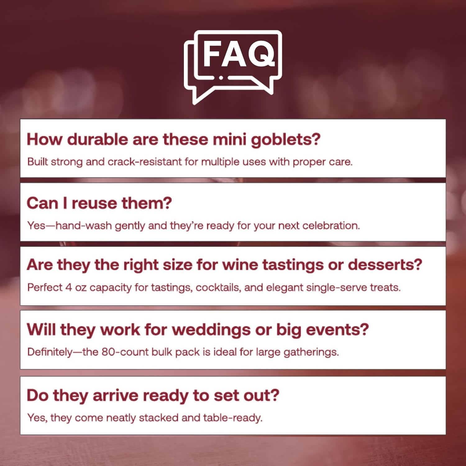 • PREMIUM QUALITY & UNBREAKABLE – Made from sturdy plastic, these 4 oz mini goblets offer the elegance of glass without the risk. Perfect plastic goblets for parties, weddings, or any celebration where durability matters!