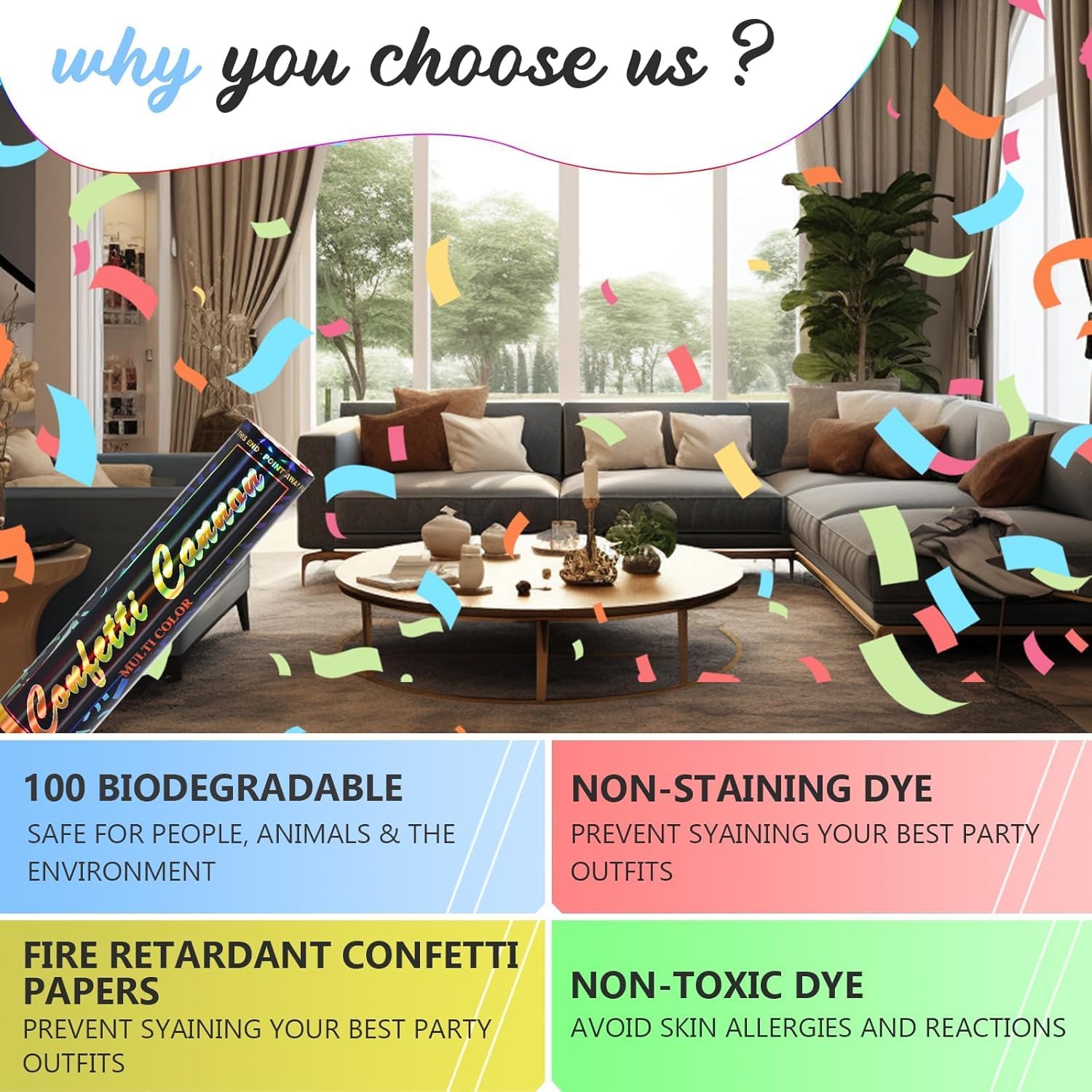 • SAFE & EASY TO USE: Our confetti cannon kit contains multicolor confetti are safe non-toxic, and made with Biodegradable confetti papers.12-inch confetti poppers shoot 10 to 15 feet in the air and color party poppers confetti shooters work well indoors and outdoors easy to clean and 100% safety, you and your guests can enjoy confetti cannon for your celebrations party.
