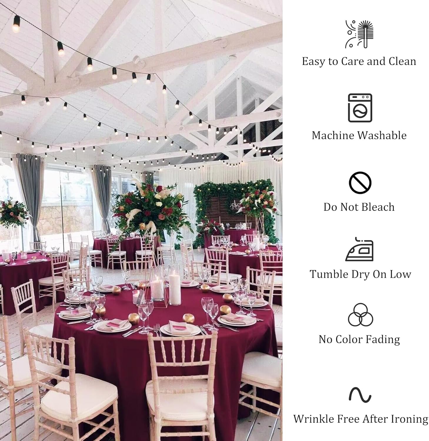 • Easy to Clean: these circle tablecloth are easy to clean, machine washable and hand washable, tumble dry on low, won't fade, won't tear easily, no bleach, wrinkle free after Ironing, easy to care than most cotton tablecloth. Simple ironing after cleaning will keep them looking new.