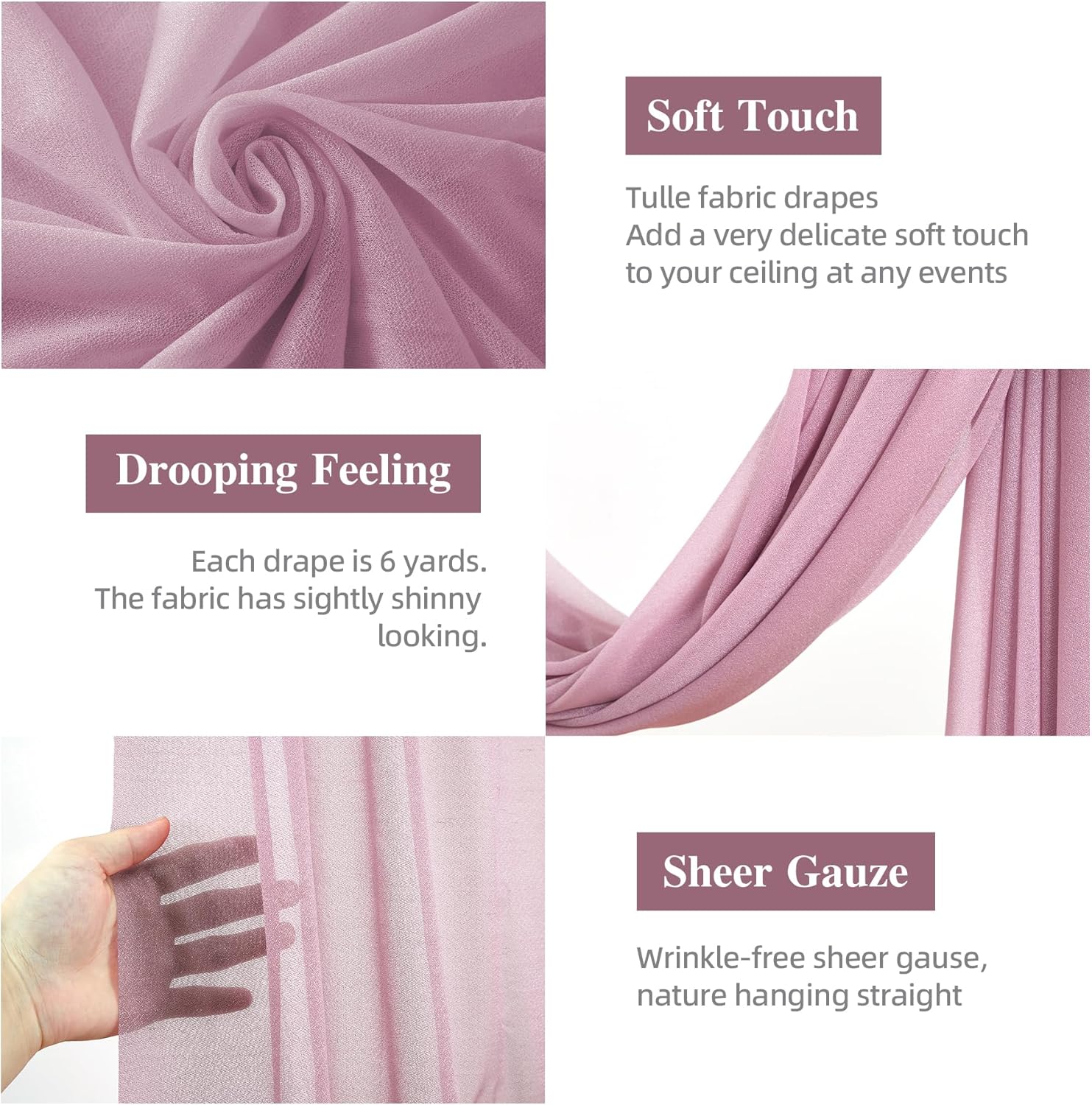 • Premium Wedding Arch Draping Fabric: These Sheer Drapes are made of 100% wrinkle-free tulle fabric, touch silky soft and looked romantic elegant, used sturdy and reusable . Whenever you use these scarf curtain, they can always keep smooth and flat.