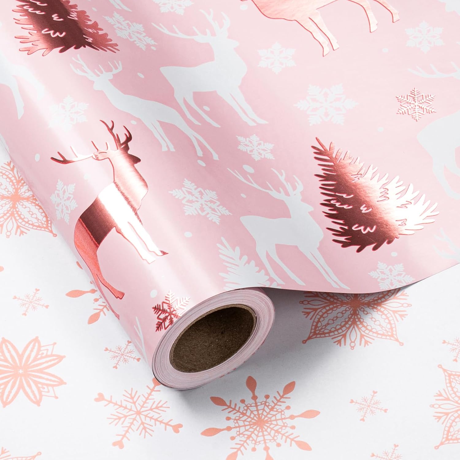 LeZakaa Christmas Pink Wrapping Paper Mini Roll, Reindeer & Snowflake, Metallic Foil, Rose Gold Foil Reversible Design for Festive Winter Holiday, Family Gathering, 17 inches x 32.8 Feet
