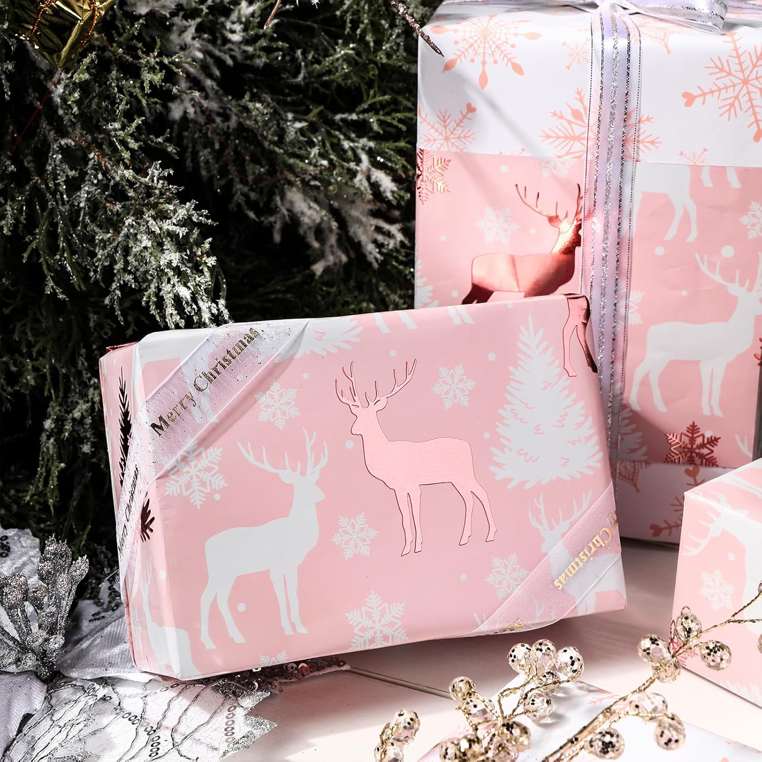 • Double-Sided Festive Design with Metallic Foil: One side shows reindeer silhouettes, Christmas trees, and snowflake accents in rose gold foil on a pink background; reverse side features rose gold foil snowflakes on a white background for versatile looks.