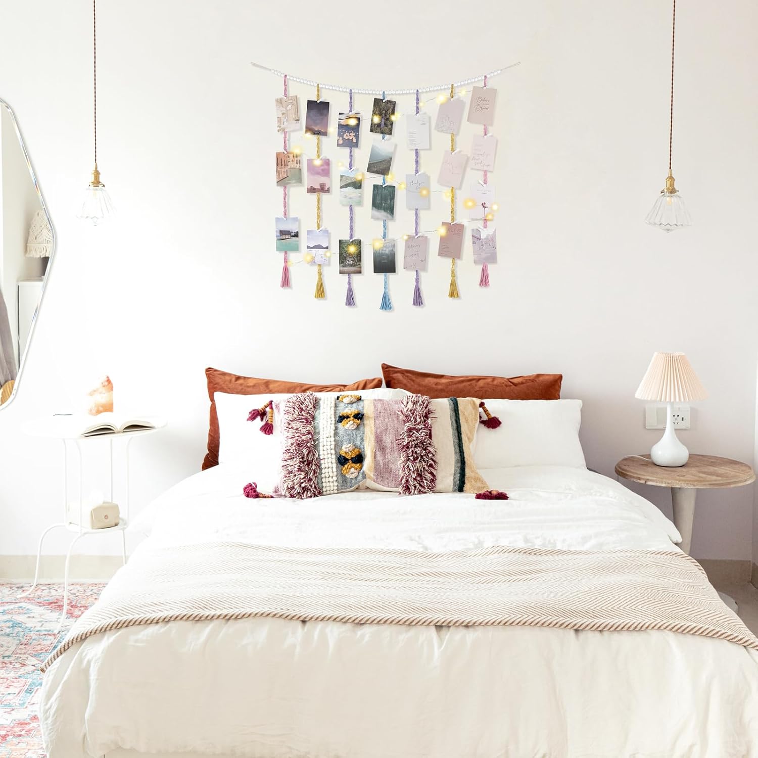 • The wall art, which has a chic outlook, uses a high quality string threaded through beads as a chain, with each vertical strand woven from macrame. The boho tassel garland comes with 45pcs removable wood clips, so you can display photos or artwork in different sizes on the string as you like. And the string lights are as soft as copper wire, so you are free to wind the shapes of the string lights into the macrame as you like.