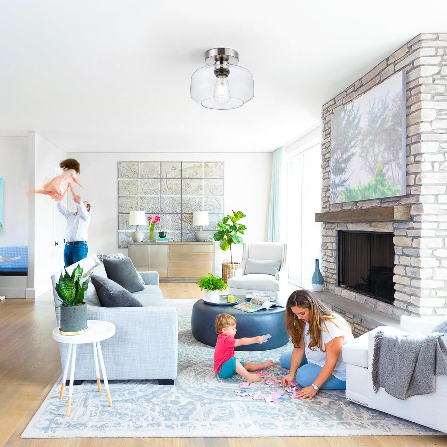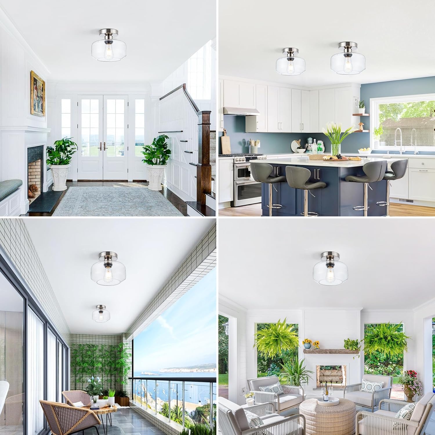• ✨ Premium Semi Flush Mount Design 1.Retro-modern brushed nickel ceiling light with hand-blown clear glass shade offering crystal-clear transparency. Rust-resistant metal base fits farmhouse, vintage and modern decors. Perfect as hallway light fixtures or bathroom ceiling light.