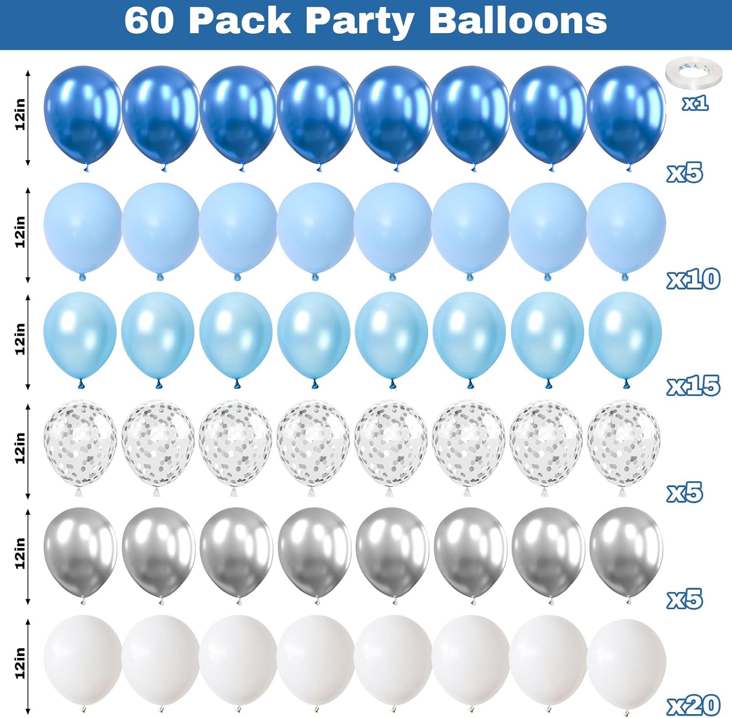 • ✨ Blue White Balloons: Our package includes 60pcs 12inch latex balloons (10pcs baby blue balloons, 15pcs pearl light blue balloons, 5pcs metallic blue balloons, 5pcs metallic silver balloons, 5pcs silver confetti balloons, 20pcs white balloons) and 1pc balloon ribbon. Perfect for upscale events, birthday, or any occasion where elegance is key. Elevate your decor with these sleek and polished light blue white balloon that will leave a lasting impression on your guests.