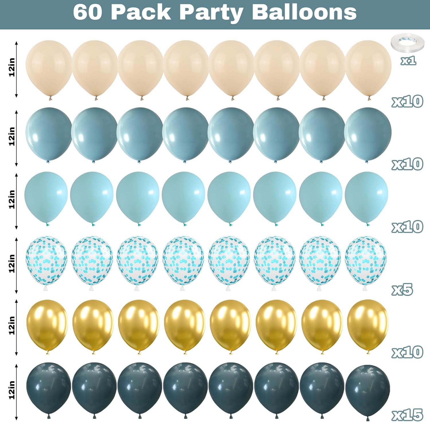 60 Pack Dusty Blue Gold Balloons, Slate Blue White Sand Teal Turquoise Crem Beige Latex Balloon Set Confetti Helium Balloon for Birthday Boho Baby Boy Shower Wedding Party Decorations