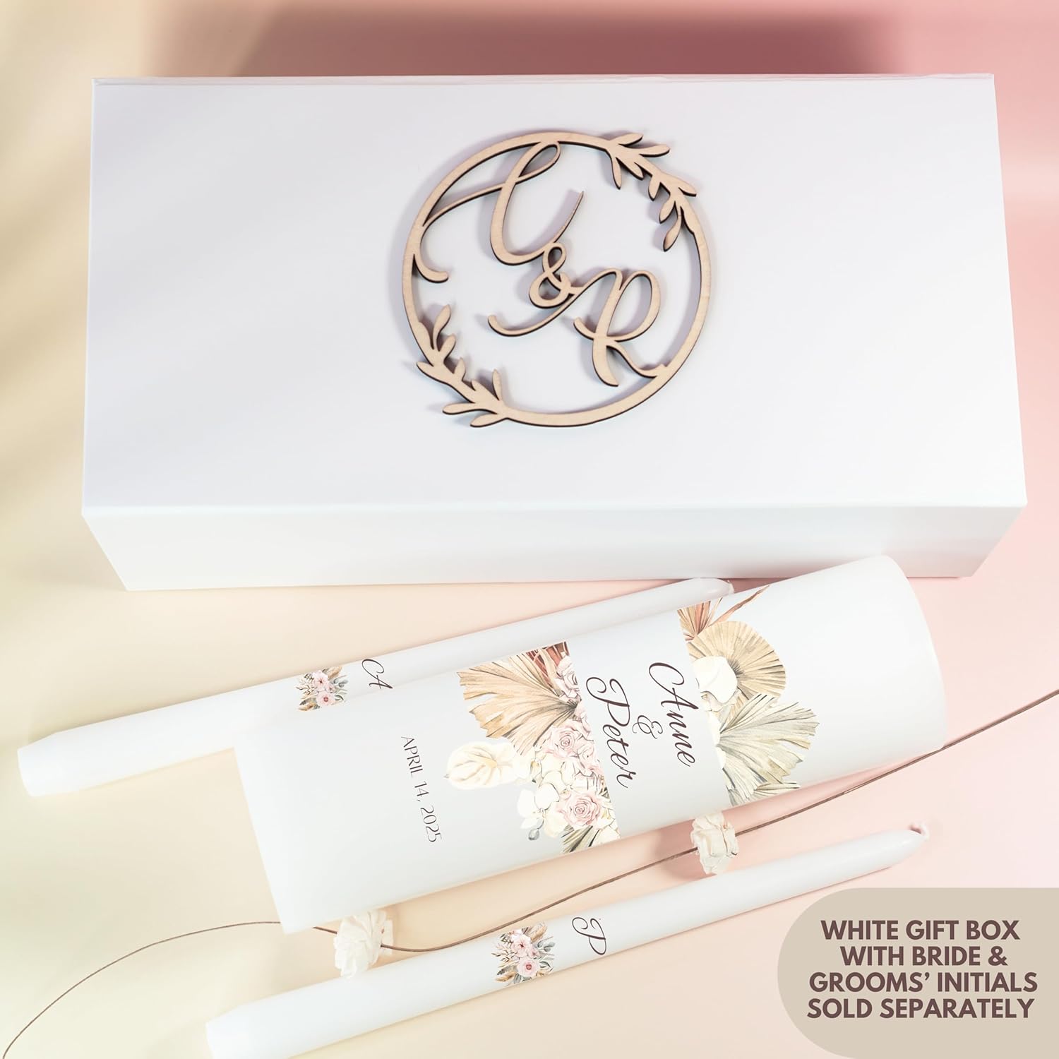 Unity Candles for Wedding, Modern Unity Set, Custom and Personalized Pillar and Taper Candles, Unscented White Premium Wax, Religious and Wedding Ceremony, Special Events (Palm)