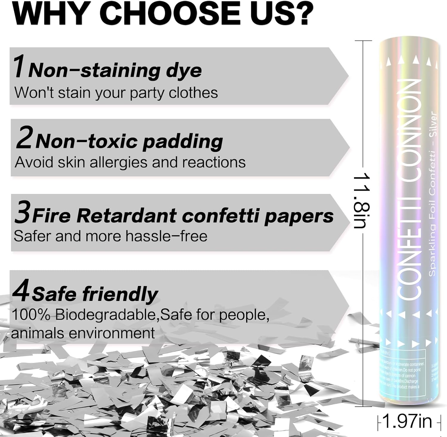 • Versatile Party Confetti Cannon: Our silver confetti cannons are the perfect accessory for any event, from weddings to birthday parties to family reunions. With their eye-catching silver confetti and impressive shooting range, they're sure to be the life of the party, adding a touch of sparkle and elegance to every occasion.