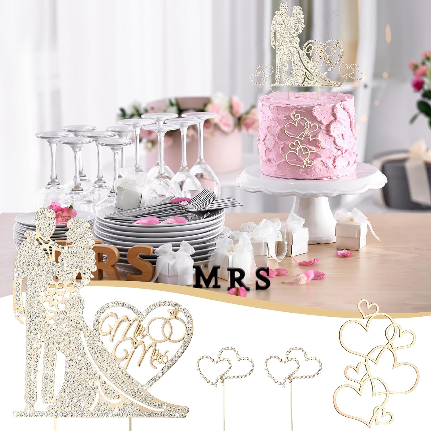 • Size Information: the Mr and Mrs cake topper measures about 5.3 x 3.9 inch, and the rhinestone heart cake toppers are about 1.97 x 1.38 inch, appropriate size for decorating a variety kinds of items
