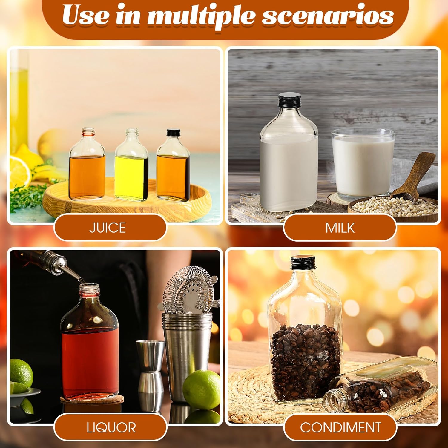 • Nice Kitchen Tools: these small glass bottles have enough capacity, not only suitable for alcohol, liquor, whiskey, but also nice for you to dispense of juices, essential oils and more, bringing more convenience for your life