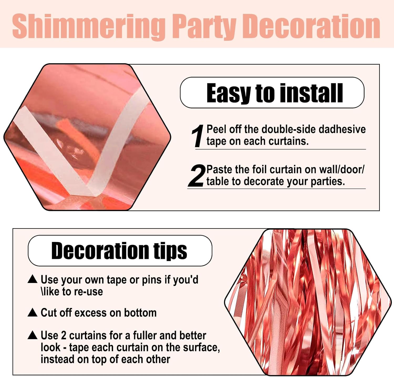 • Easy To Assemble | Strong Adhesive | Not Easy Fade : The foil fringe curtain backdrop party decorations come with double-sided adhesive tape, easy to use, just tear off the back of adhesive tape, then paste this streamers backdrop curtains on the top of wall, window, table, or as door fringe decoration.