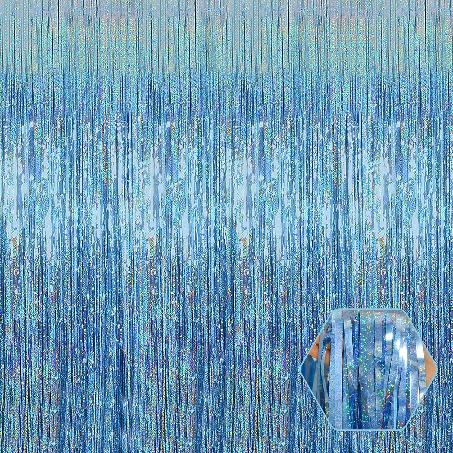3 Pack Light Blue Foil Fringe Curtain Backdrop, 3.28Ft x 8.2Ft Metallic Tinsel Foil Fringe Streamer Curtains for Photo Booth, Mother's Day, Easter, Birthday, Wedding Party Decorations