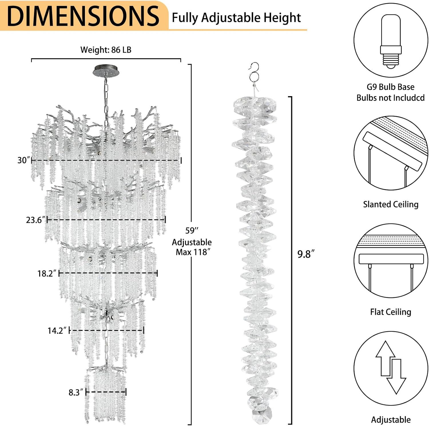 • 【Luxury Crystal Chandelier】This 28-light silver crystal chandelier for the high-ceilinged foyer entrance draws inspiration from nature, designed to resemble lush tree branches. It sparkles and exudes luxury, symbolizing abundance in love, career, family, and friendship. The chandelier features exquisite meticulously crafted from 100% transparent K9 crystal, offering purity and romance, shimmering with diamond-like brilliance. When illuminated, the entire fixture radiates a natural artistic beauty