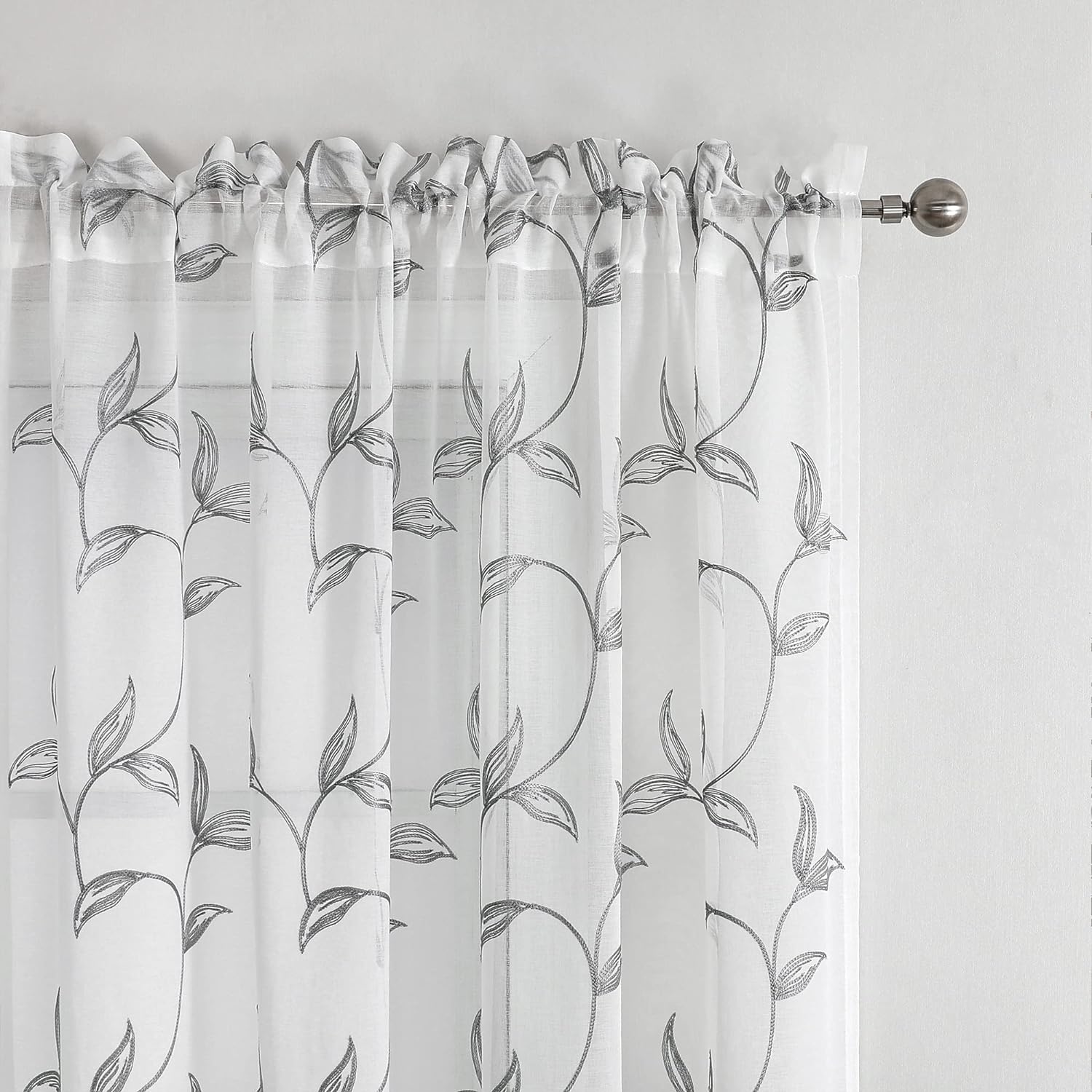 VISIONTEX Sheer Curtains 108 Inch Length 2 Panels, Decor Iron Grey Vine Leaves Embroidery on White Voile Pair, Accent Semi Window Drapes for Kitchen, Living Room and Bedroom, 54" W x 108" L