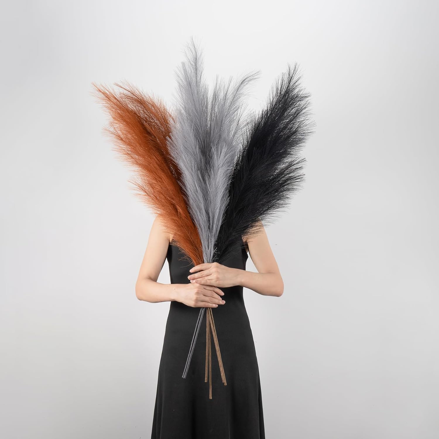 • High End Looking Faux Pampas Grass: It's actually made of a metal wire in the stem and silk feather, it holds shape very well. The pompass grass branches tall bulk is really soft and feather-like, with 18 branches on each stem, and the heads of each stem are designed so you can fluff them up for a fuller look