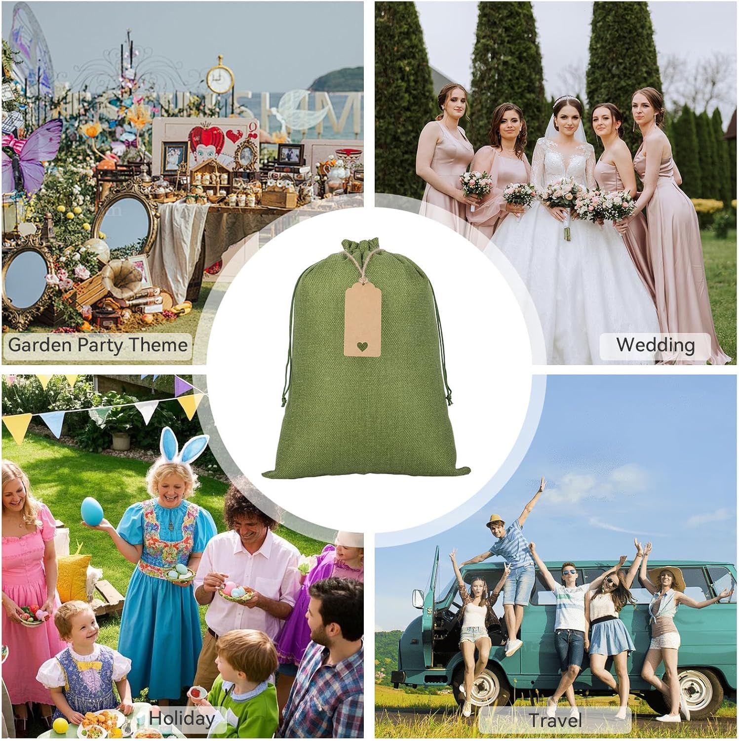 Tapleap Burlap Bags with Drawstring - 10Pcs 10x14 Green Gift Sacks for Wrapping Halloween Favors, Clothes, Toiletries, Breads, Root Ball, For Birthday, Wedding, Party or Household Use