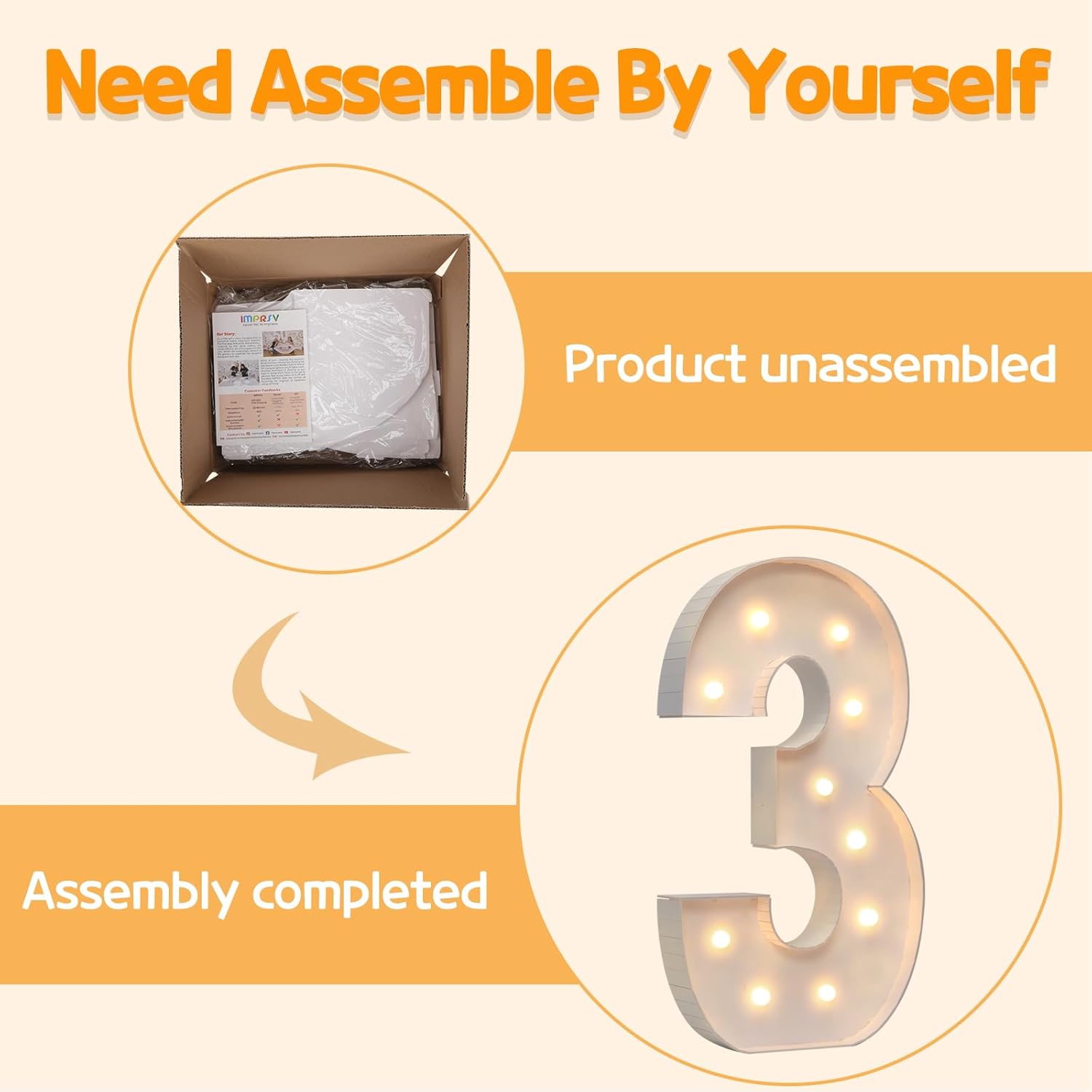 • Assembly Required: Our large marquee numbers is made from foam board and easy to assemble with our splicing mode. Just follow the numbered instructions to align and insert the bottom plate, and reinforce it with a hot glue gun. Then, you're done!