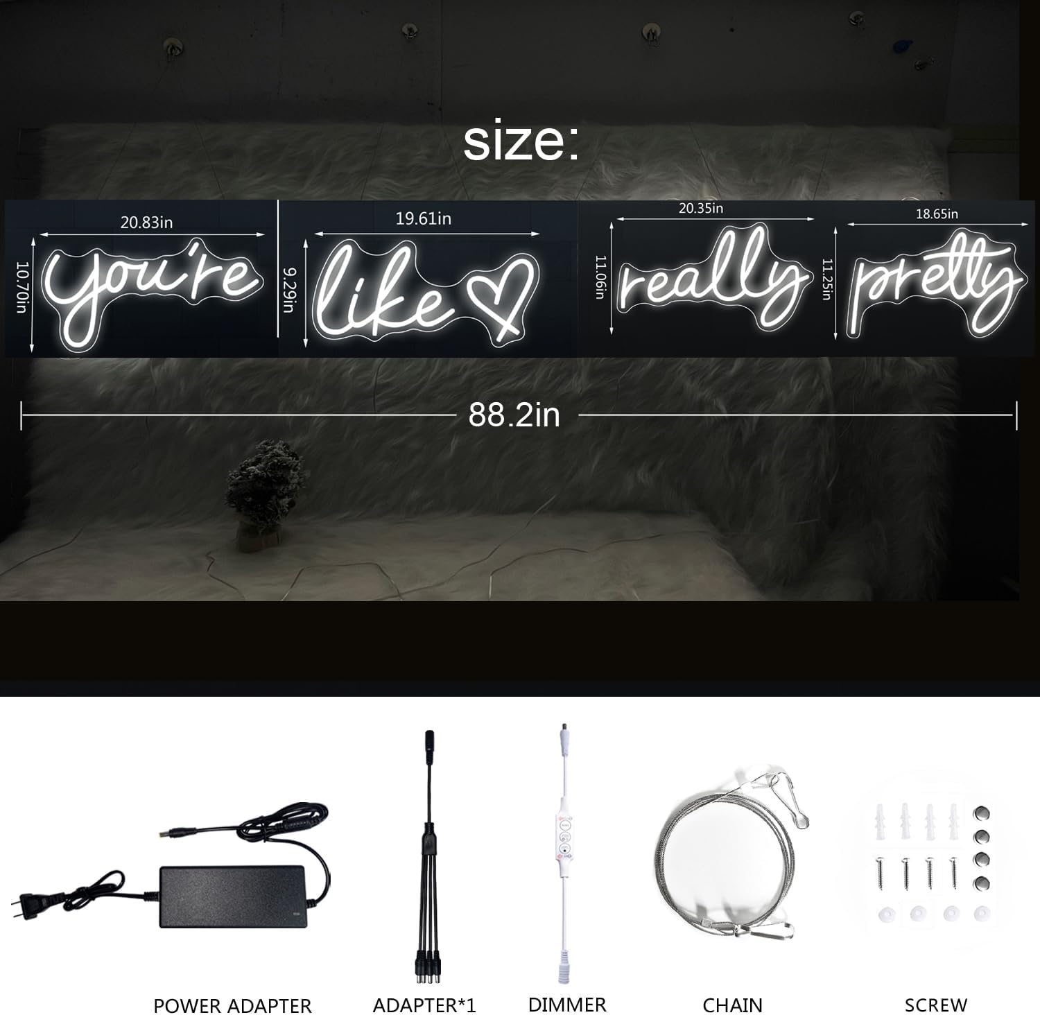 • Exquisite Art Carving Design: Our neon lights feature a stunning art carving design crafted with silicone light strips and wear-resistant acrylic backplates. The "You're Like Really Pretty" message is intricately engraved on crystal-clear acrylic. Enhanced with surrounding pink LED neon strip lighting, the engraved letters illuminate, showcasing the vibrant colors of the strip.