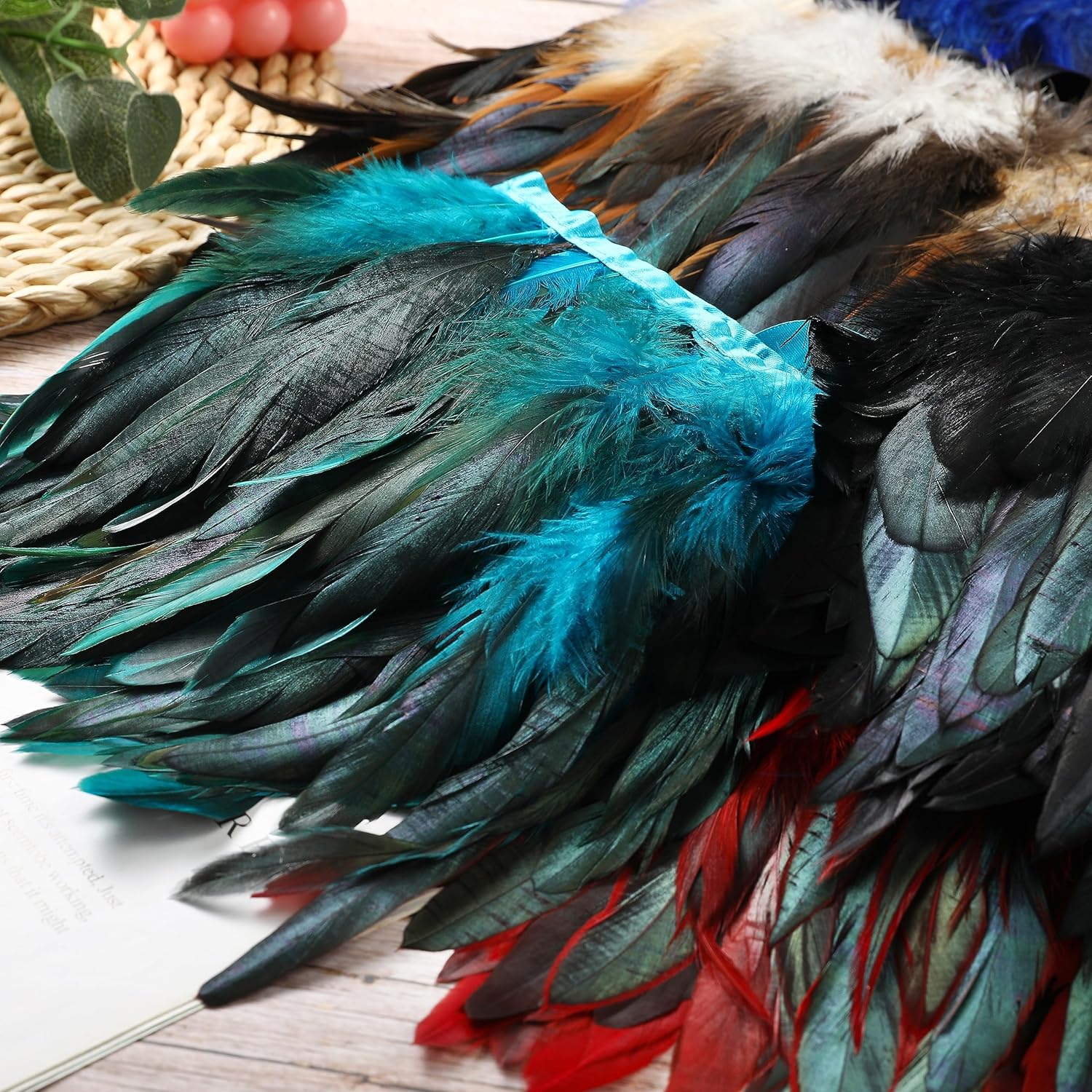 • Easy to Cut and Sew: Each rooster feather trim is 2 yards long and 5-7 inches wide.This rooster feather decoration is sewn with dyed rooster tail feathers and ribbons, it can be cut and sewn to size, suitable for any DIY feather handicraft, such as skirt, gloves, hats, masks, vases, wings, wreaths, etc