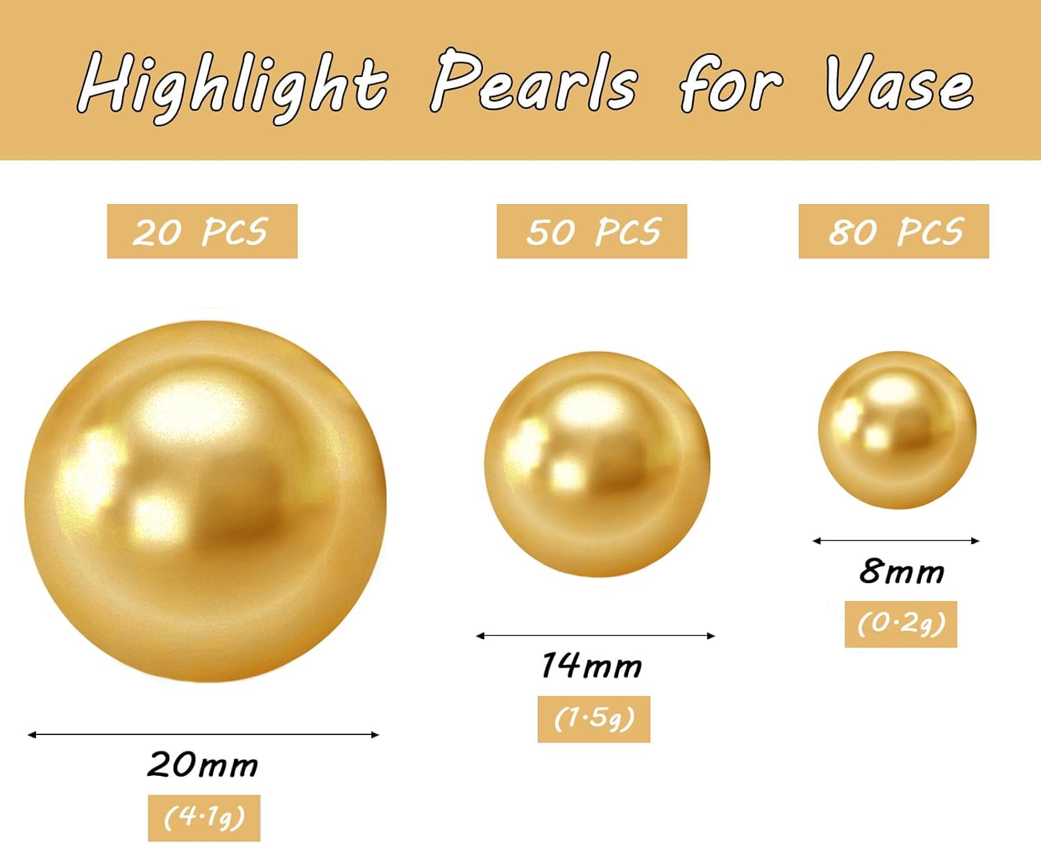 150Pcs Gold Polished No Hole Faux Pearl Beads for Vase Filling Decorations, Plastic Pearls Vase Fillers, Table Scatters, Wedding Centerpiece, Home Decor, 8/14/20 mm