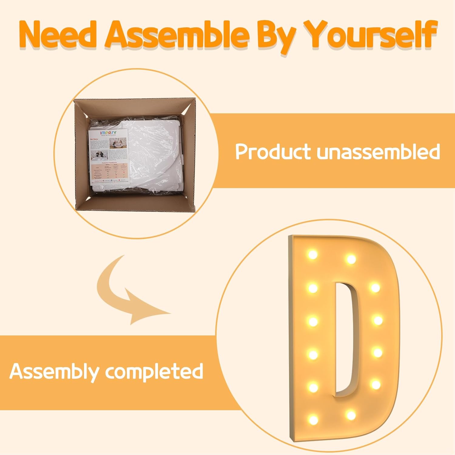 • Assembly Required: Our large marquee letters is made from foam board and easy to assemble with our splicing mode. Just follow the numbered instructions to align and insert the bottom plate, and reinforce it with a hot glue gun. Then, you're done!