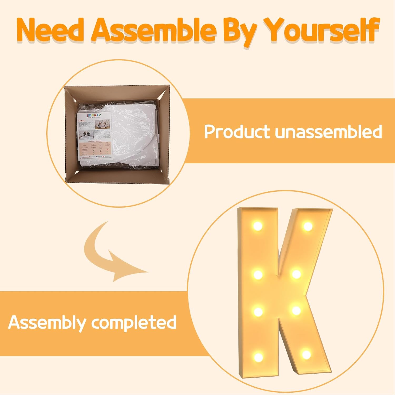 • Assembly Required: Our large marquee letters is made from foam board and easy to assemble with our splicing mode. Just follow the numbered instructions to align and insert the bottom plate, and reinforce it with a hot glue gun. Then, you're done!