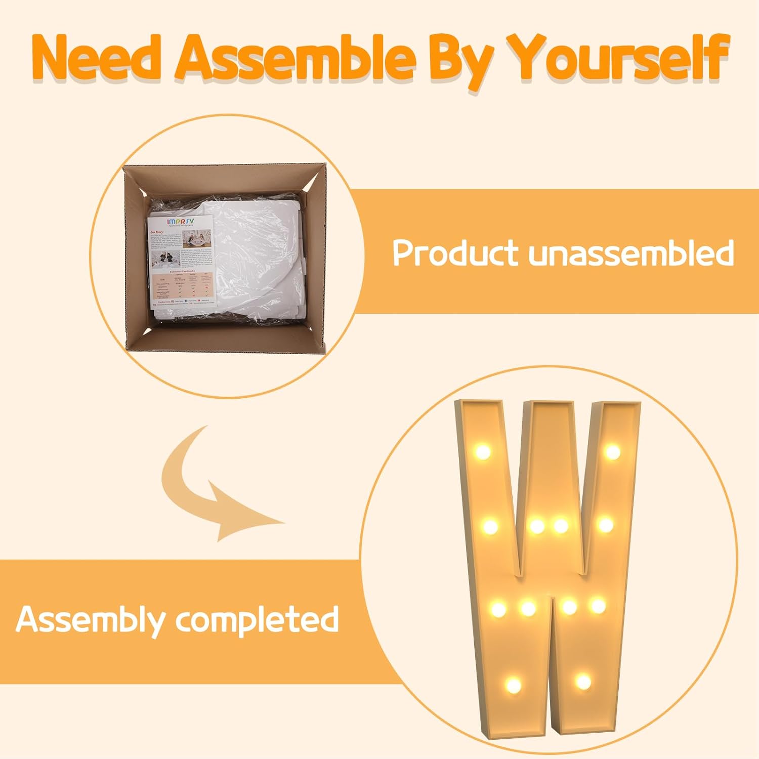 • Assembly Required: Our large marquee letters is made from foam board and easy to assemble with our splicing mode. Just follow the numbered instructions to align and insert the bottom plate, and reinforce it with a hot glue gun. Then, you're done!