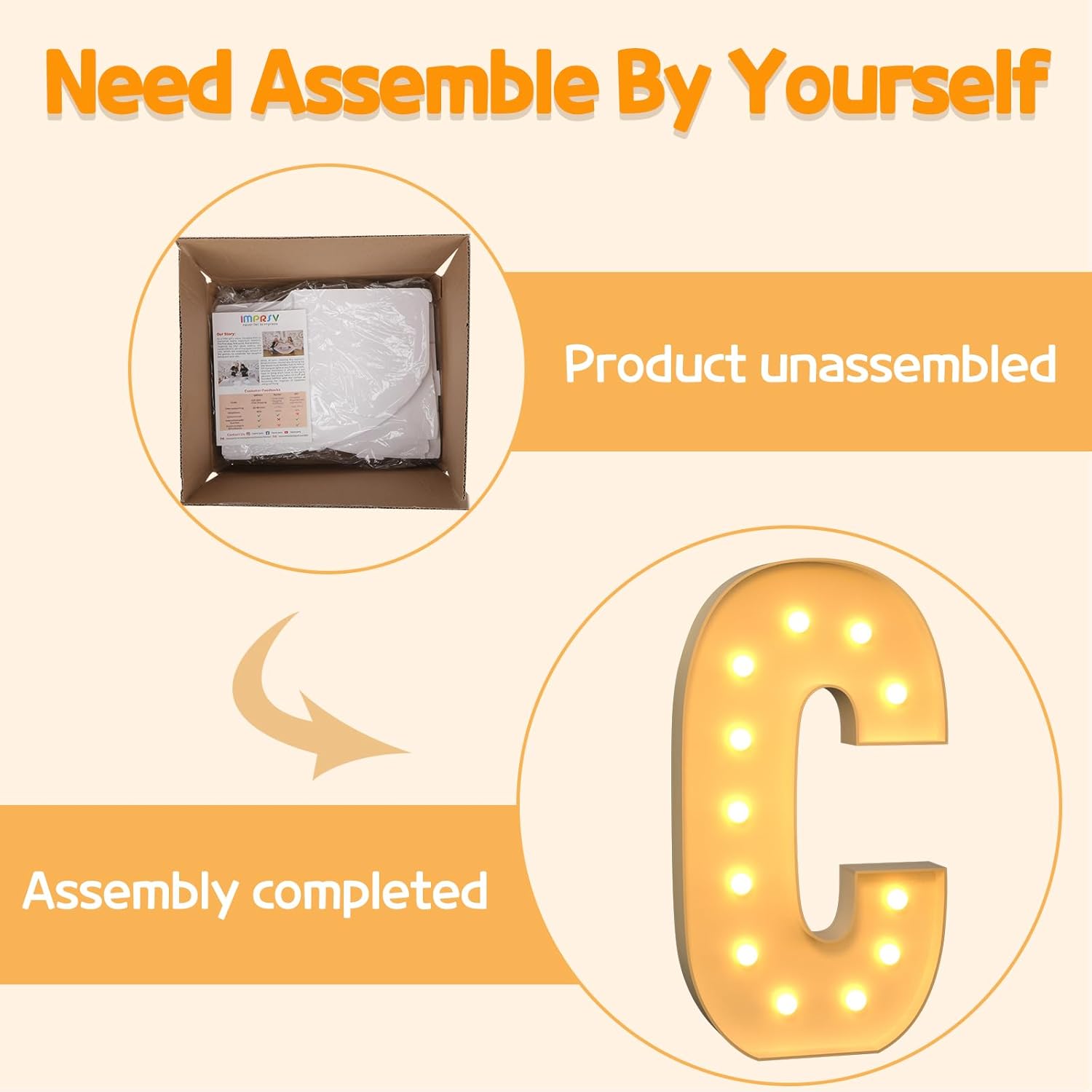 • Assembly Required: Our large marquee letters is made from foam board and easy to assemble with our splicing mode. Just follow the numbered instructions to align and insert the bottom plate, and reinforce it with a hot glue gun. Then, you're done!
